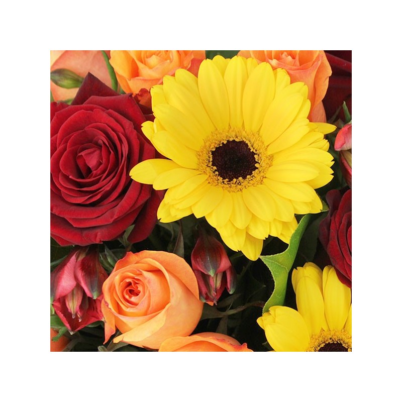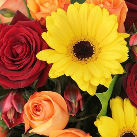 Bouquet rond dans les tons rouge, orange, jaune et vert, composé de petites roses, germinis, fleurettes et feuillages, accompagné de sa boite de 16...