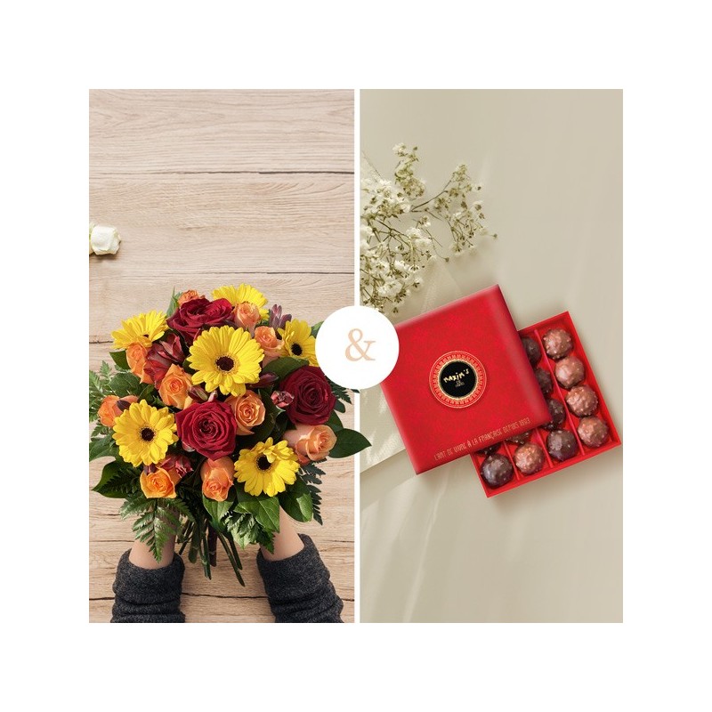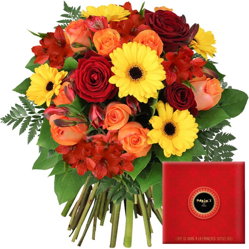 Bouquet rond dans les tons rouge, orange, jaune et vert, composé de petites roses, germinis, fleurettes et feuillages, accompagné de sa boite de 16 rochers pralinés Maxim's au chocolat au lait et chocolat noir (160g).