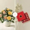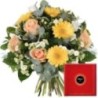 Bouquet dans les tons jaune, blanc et orange composé de roses, germinis jaunes, fleurs de saison et feuillage, accompagné de sa boite de 16 rochers...