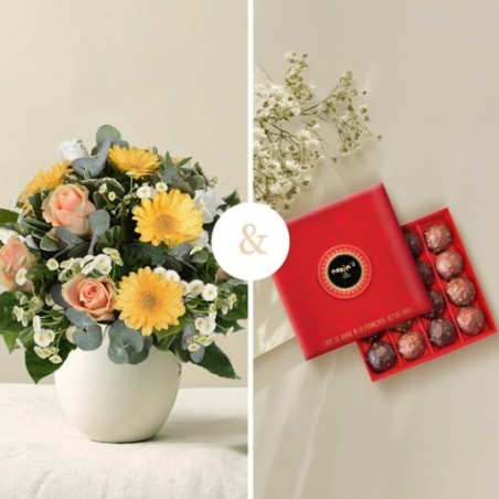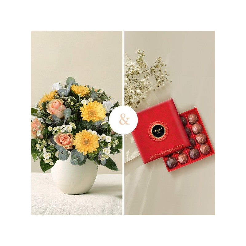 Bouquet dans les tons jaune, blanc et orange composé de roses, germinis jaunes, fleurs de saison et feuillage, accompagné de sa boite de 16 rochers pralinés Maxim's au chocolat au lait et chocolat noir (160g).