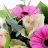 Bouquet dans les tons de roses composé de germinis, roses, tulipes et autres fleurs de saison, accompagné de sa boite de 12 rochers pralinés Maxim'...