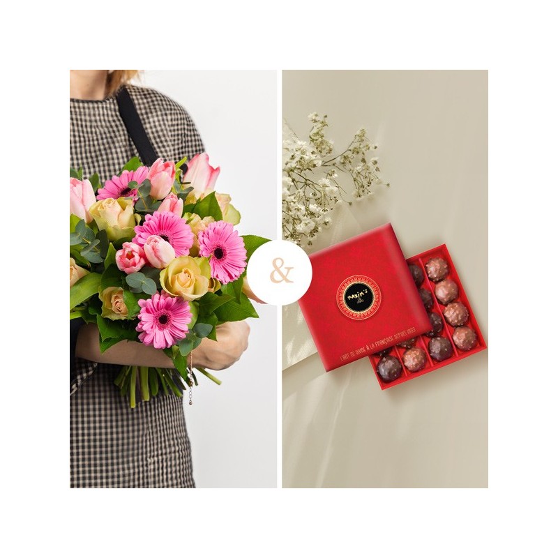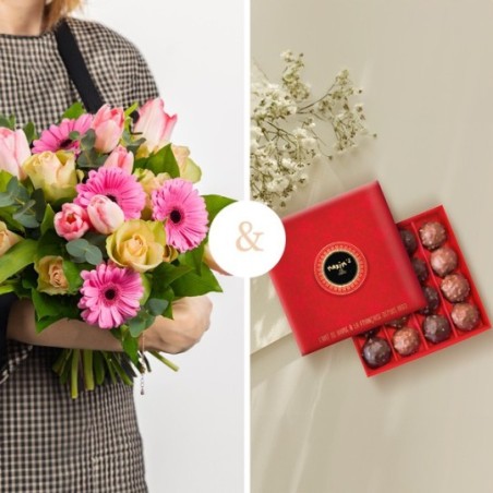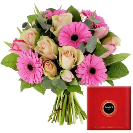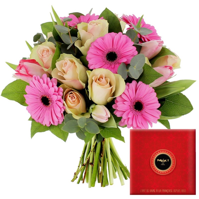 Bouquet dans les tons de roses composé de germinis, roses, tulipes et autres fleurs de saison, accompagné de sa boite de 12 rochers pralinés Maxim's au chocolat au lait et chocolat noir (160g).