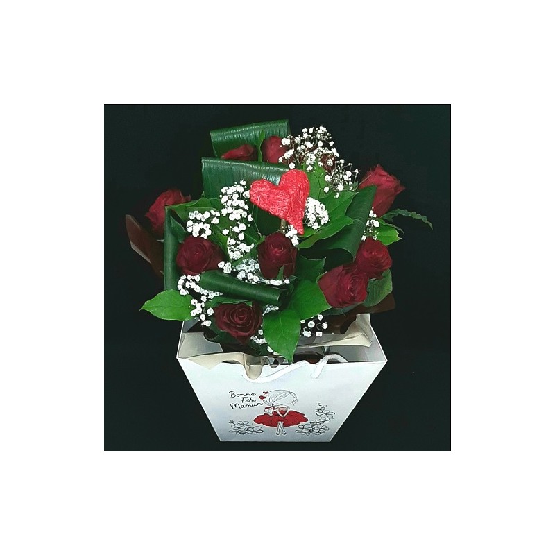 COMPOSE DE 9 ROSE ROUGE PB, 2 GYPSO, 5 ASPIDISTRA, 1 POCHE SALAL, 1 PIC CŒUR SISAL ROUGE, 1 BULLE GRAND MODELE ROUGE LIN, 1 SAC TRAPEZE FDM (sac non contractuel)