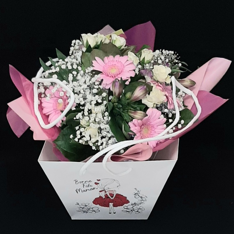 COMPOSE DE 3 GERMINI ROSE, 3 MATRICAIRE, 3 ROSE BUISSON ROSE, 3 GYPSO, 3 ALSTRO ROSE, 1 POCHE SALAL, 1 BULLE GM ROSE/ROSE PALE/BLANC
