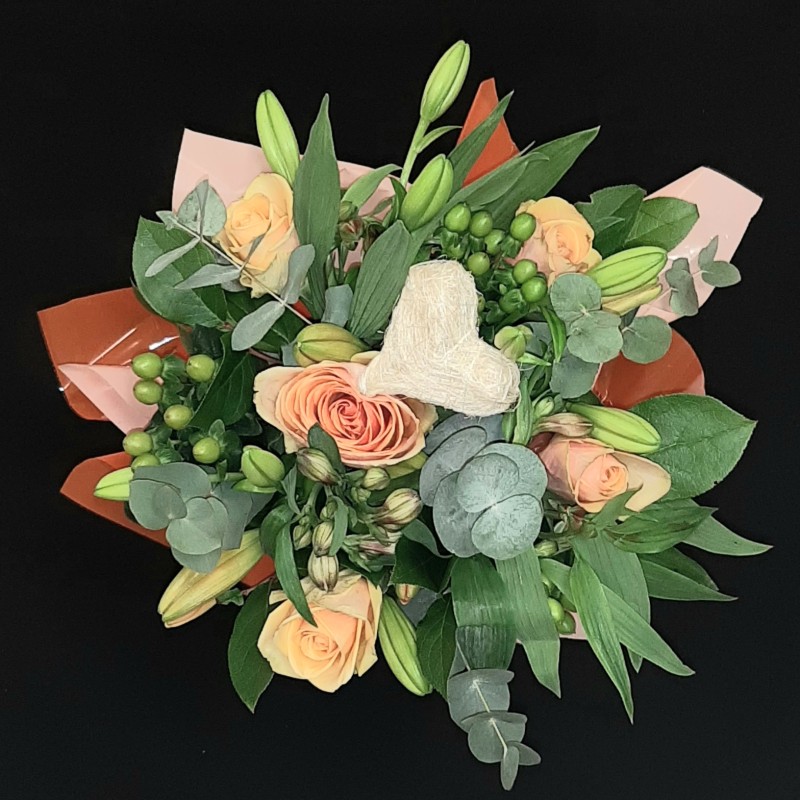 COMPOSE DE 3 ROSE ORANGE ALCHEMY, 3 HYPERICUM SAUMON CLAIR, 3 LYS ORANGE ASIATIQUE, 3 EUCALYPTUS, 3 ALSTRO ORANGE, 1 POCHE SALAL, 1 BULLE GM CORAIL ORANGE