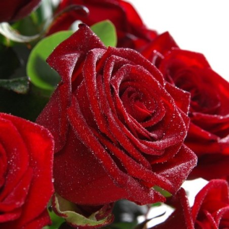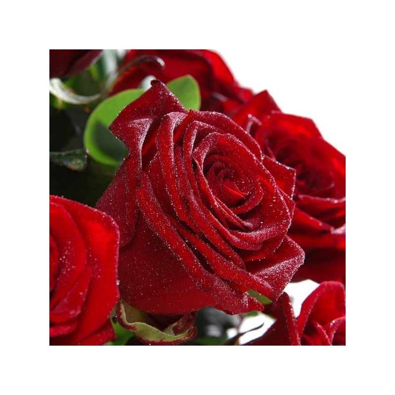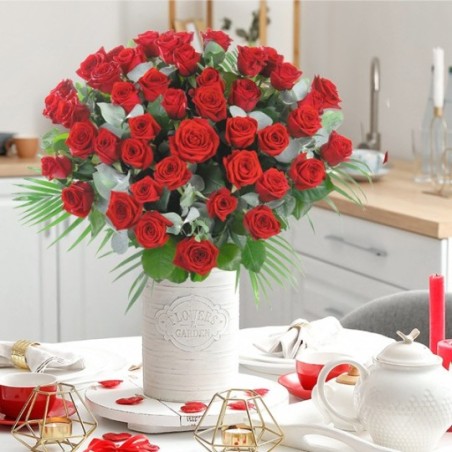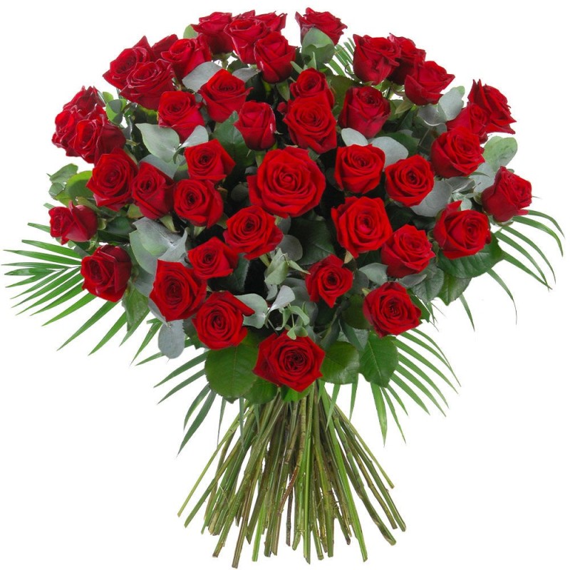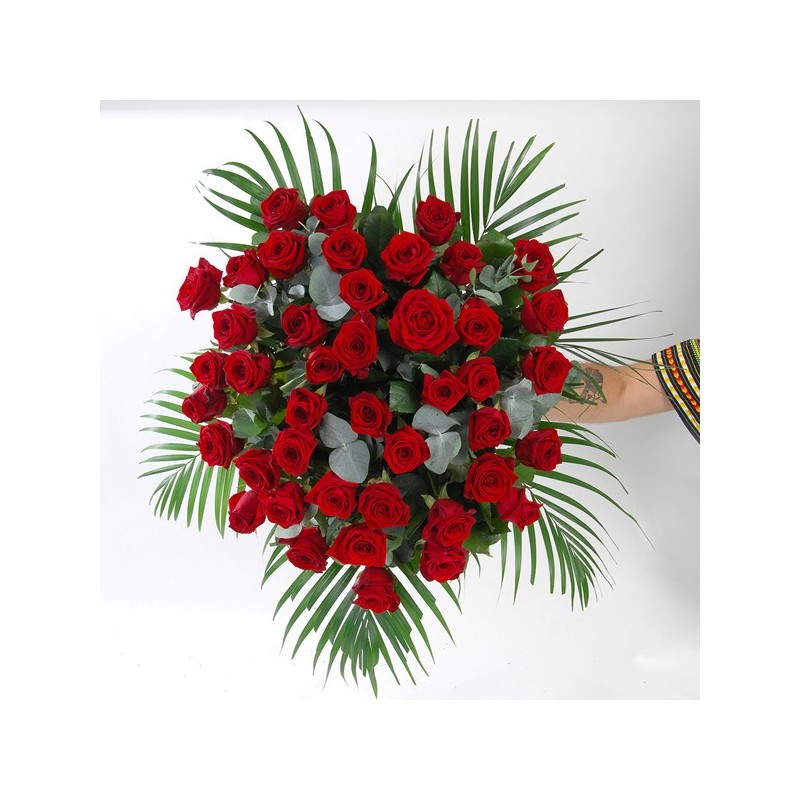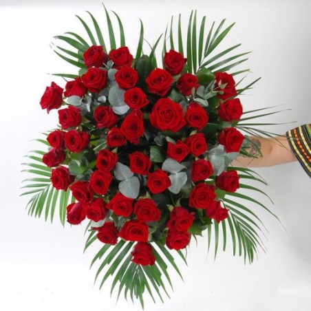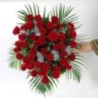 Bouquet rond dans les tons rouges composé de roses et feuillages.