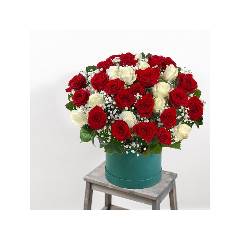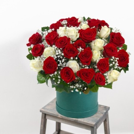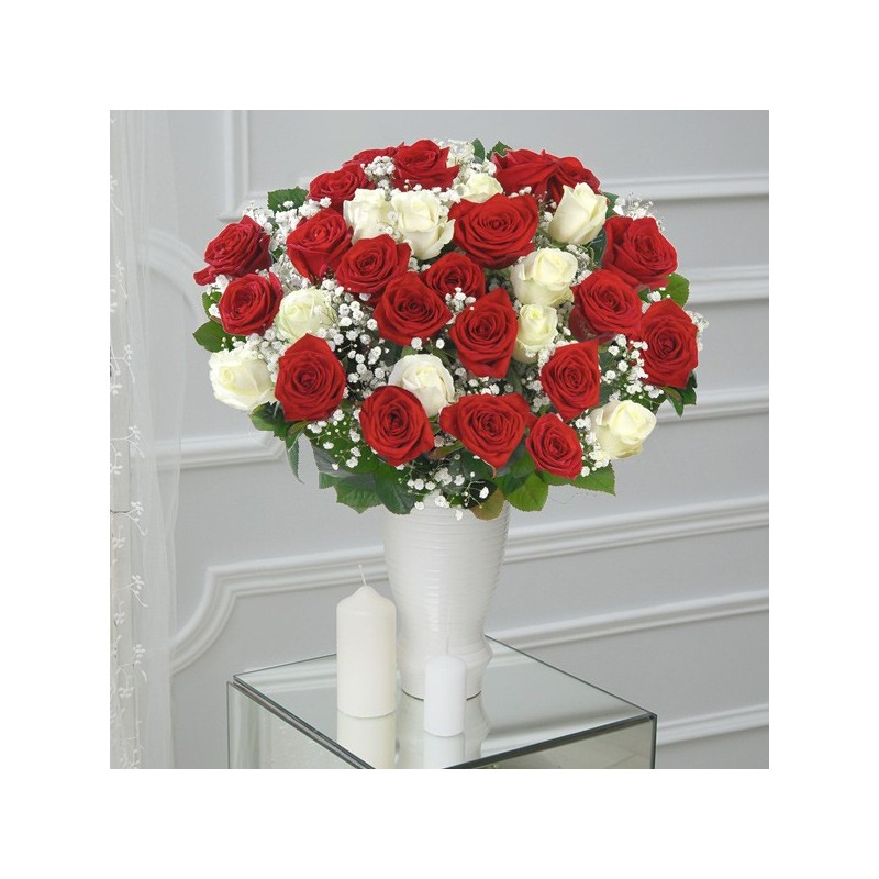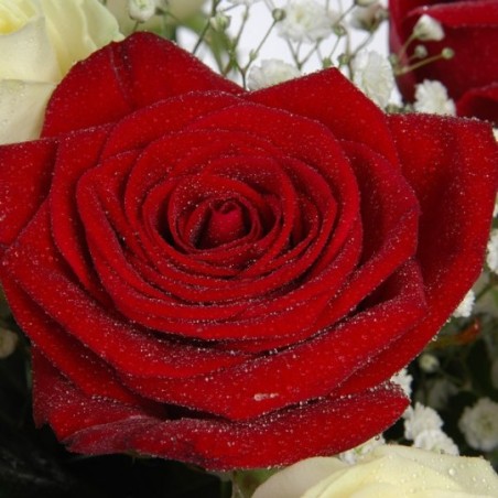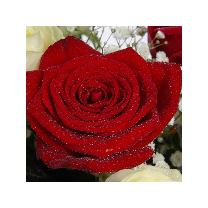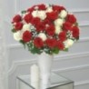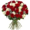 Bouquet rond dans les tons rouges et blancs composé de roses et feuillages.