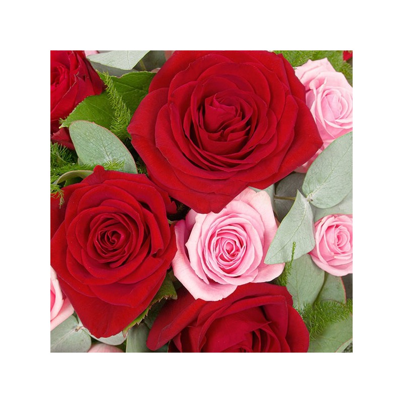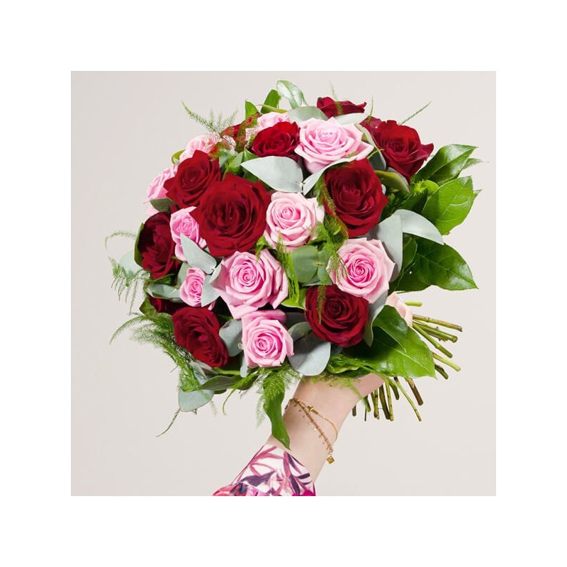 Bouquet composé dans les tons rouge et rose composé de roses et de feuillages.