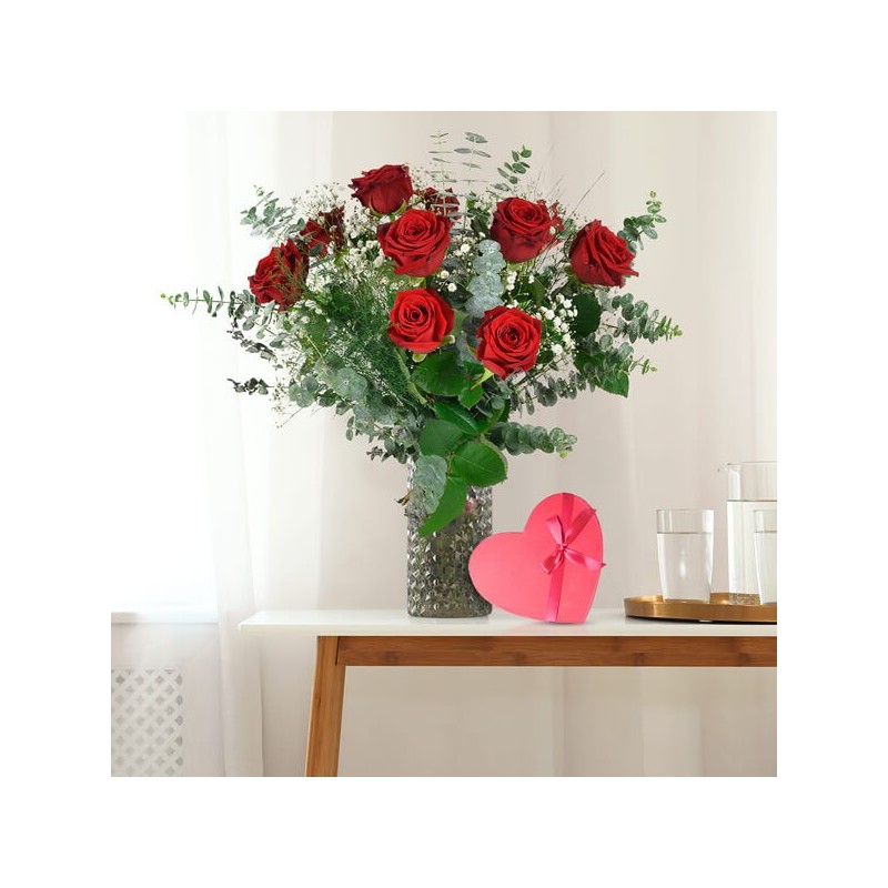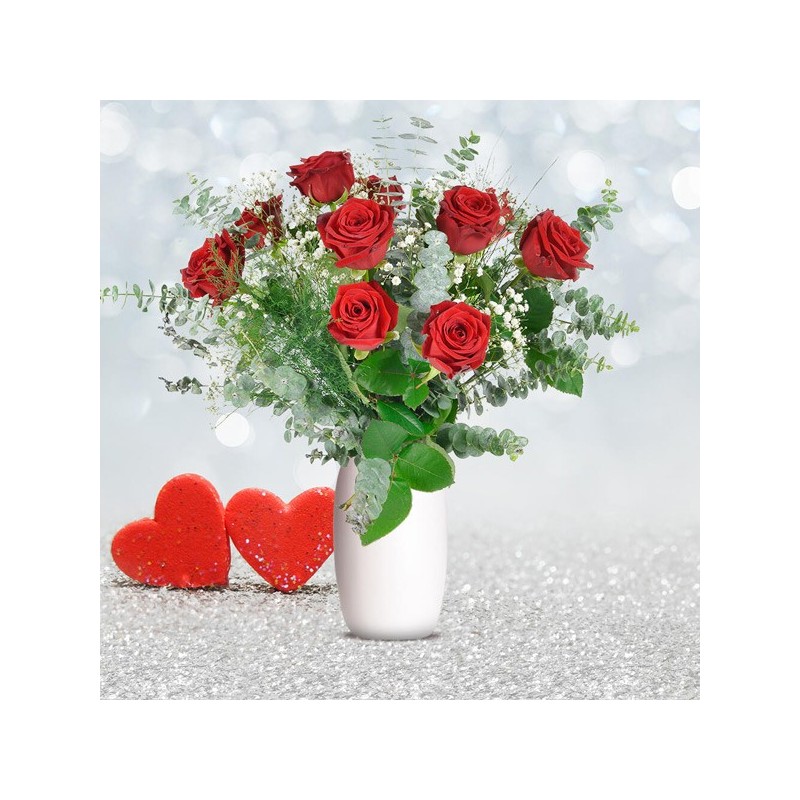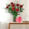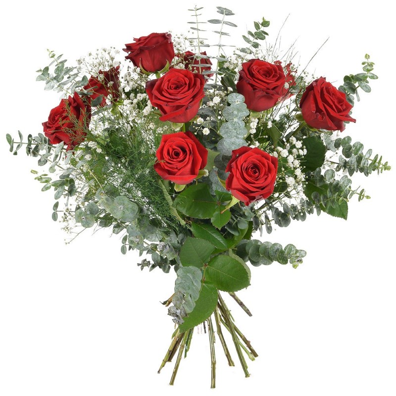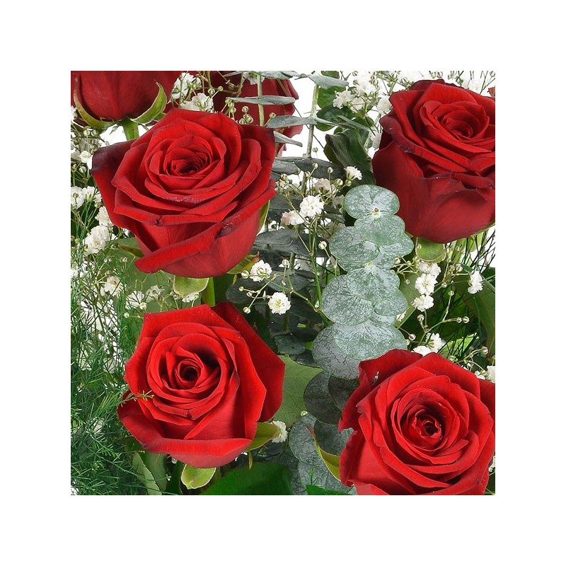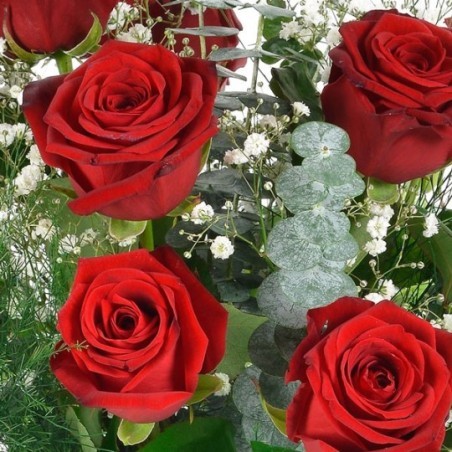Bouquet de roses rouges moyenne tige, accompagnées de gypsophile et feuillages variés (la variété et la période peuvent faire varier le prix des roses. Ainsi, pour un tarif affiché, un bouquet de roses peut être composé d'un nombre différent de tiges).