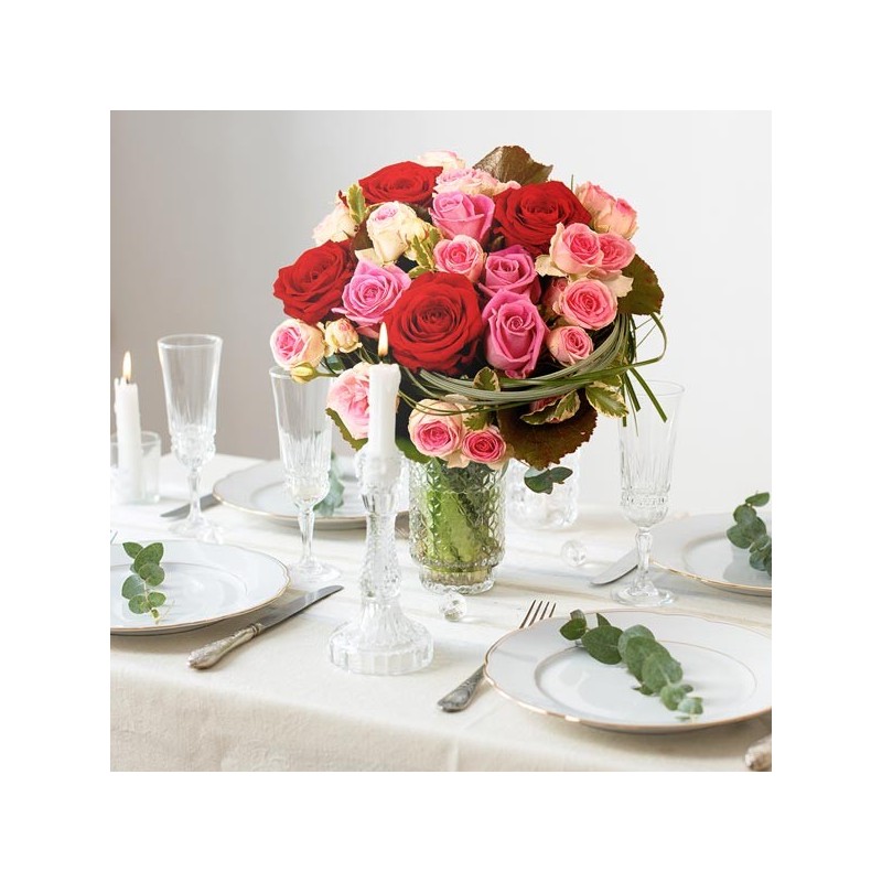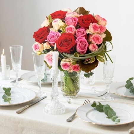 Bouquet rond dans les tons rouge et rose composés de roses et feuillages.