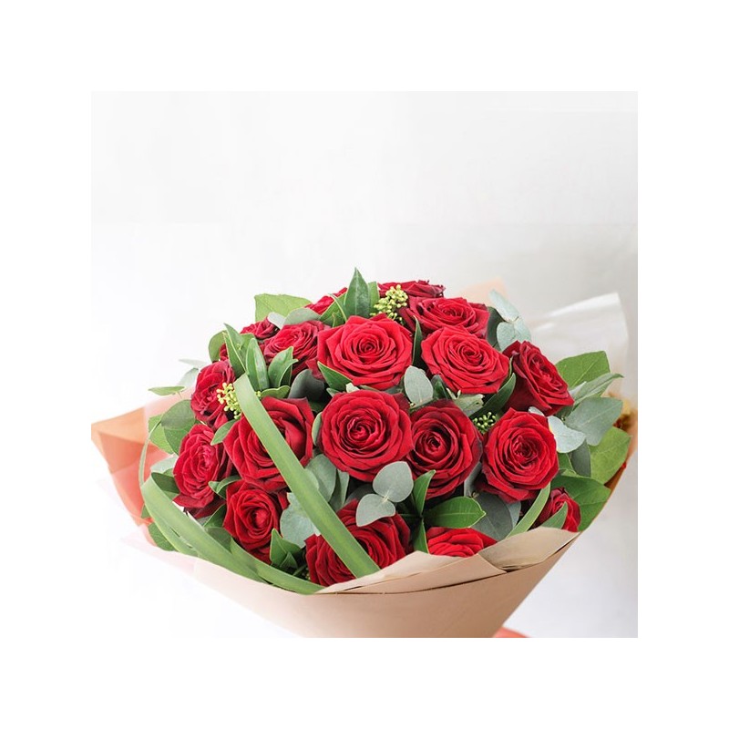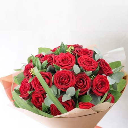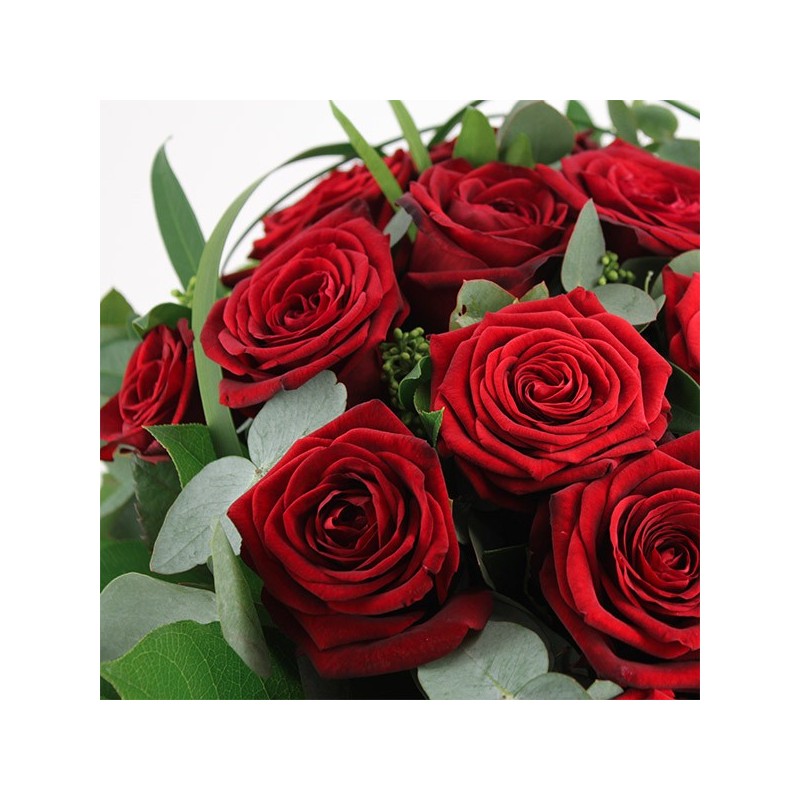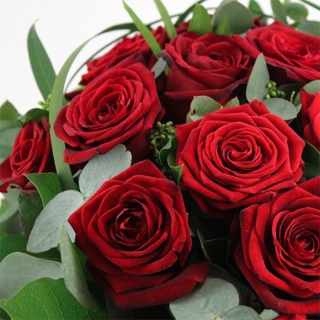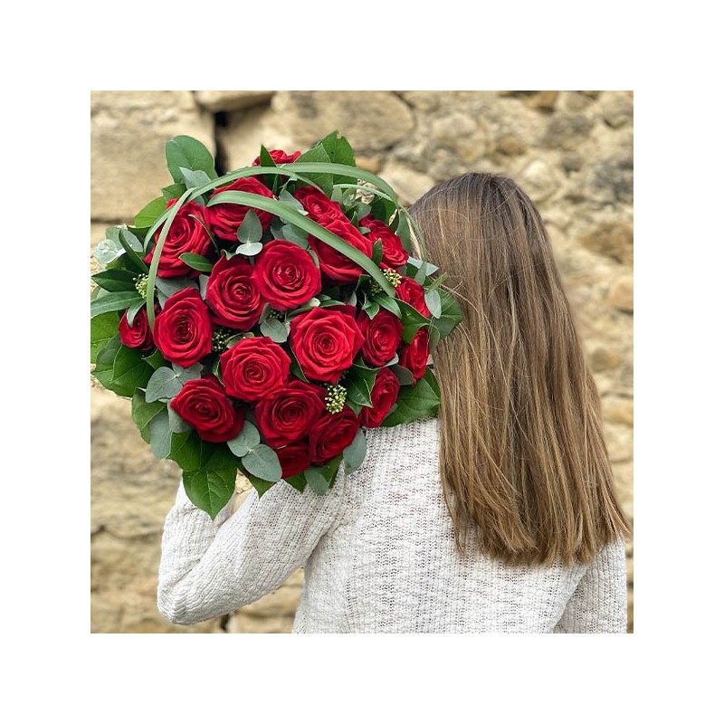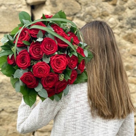 Bouquet rond dans les tons rouge et vert, composé de roses et feuillage (le nombre de roses peut varier en fonction de la variété disponible chez le fleuriste).