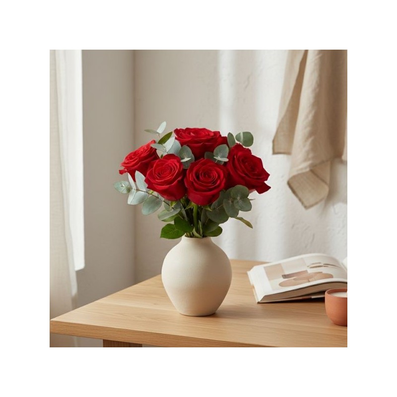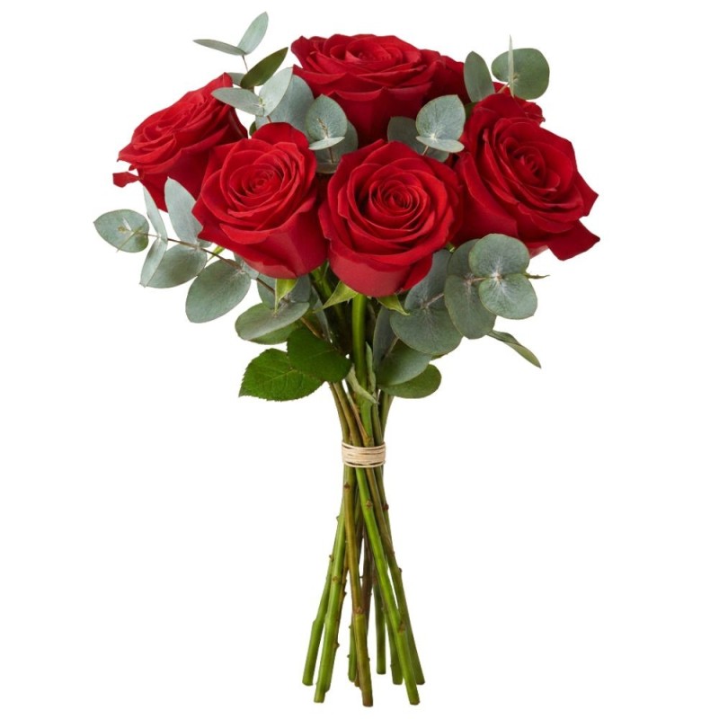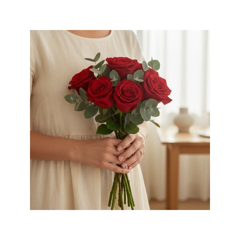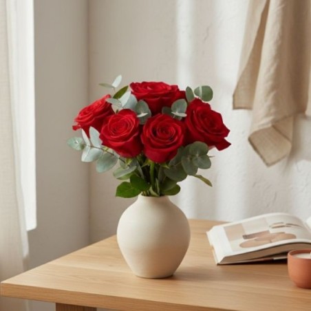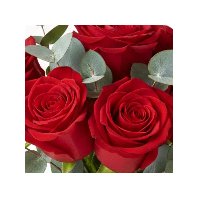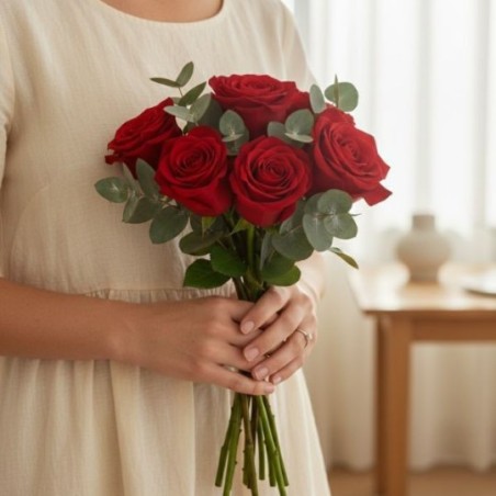Bouquet de roses rouges et son feuillage. Le nombre de tige peut varier en fonction de la saisonnalité.