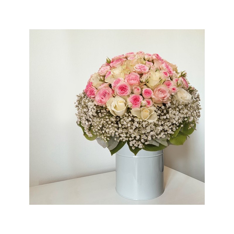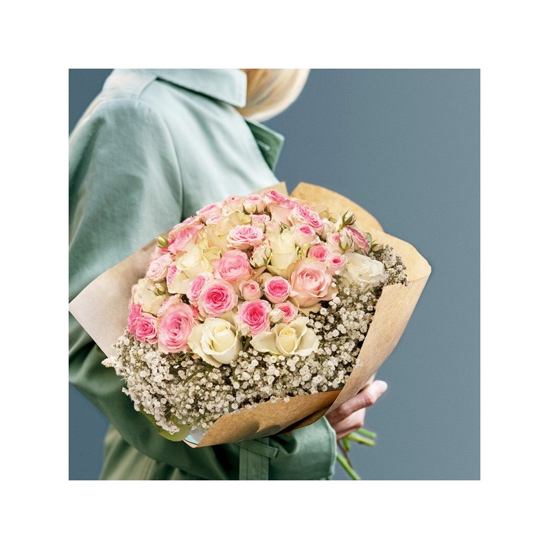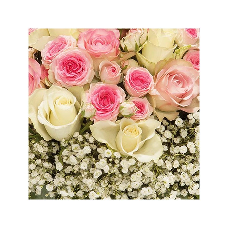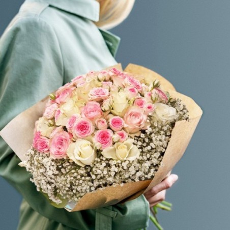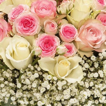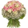 Bouquet rond dans les tons rose pâle et blanc composé de roses diverses, le tout entouré de feuillage (la variété et la période peuvent faire varier le prix des roses. Ainsi, pour un tarif affiché, un bouquet de roses peut être composé d'un nombre différent de tiges).