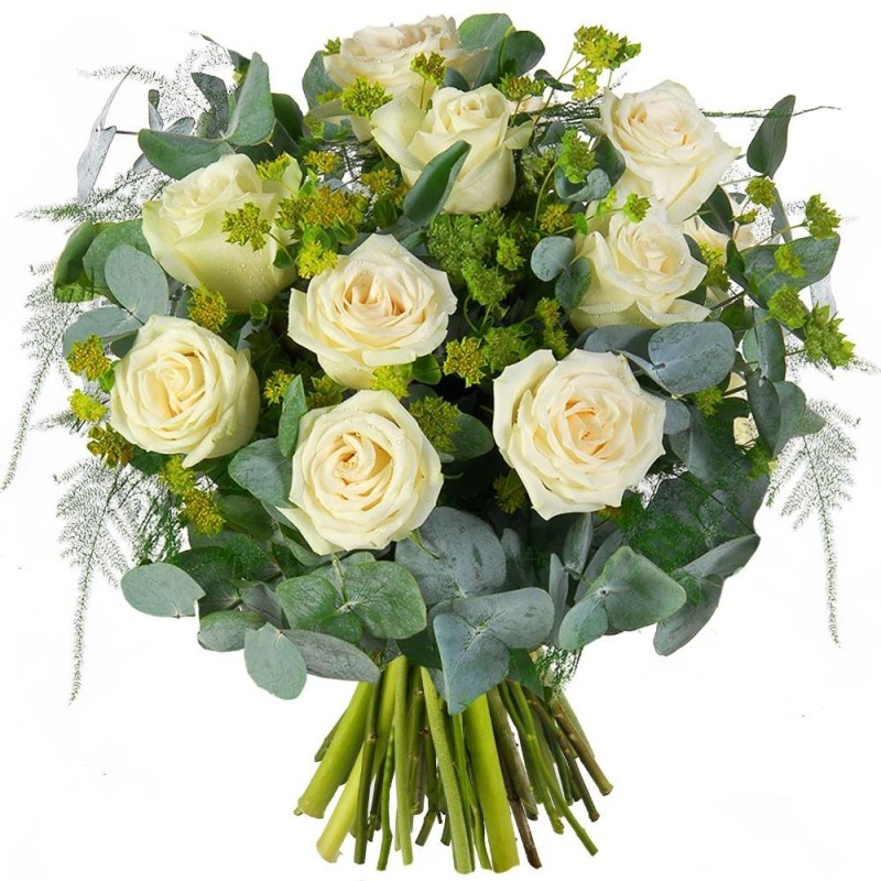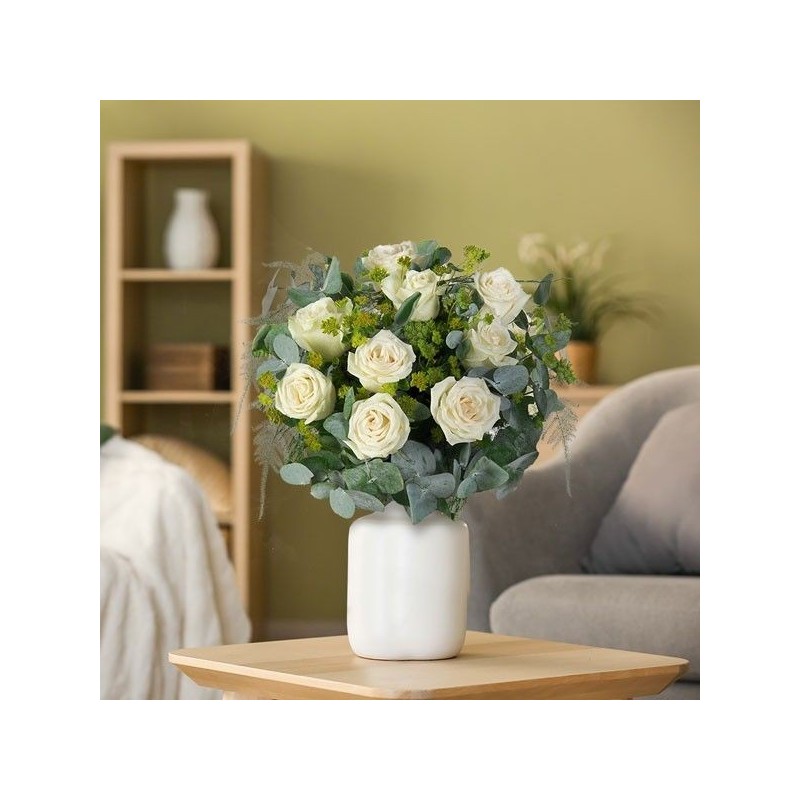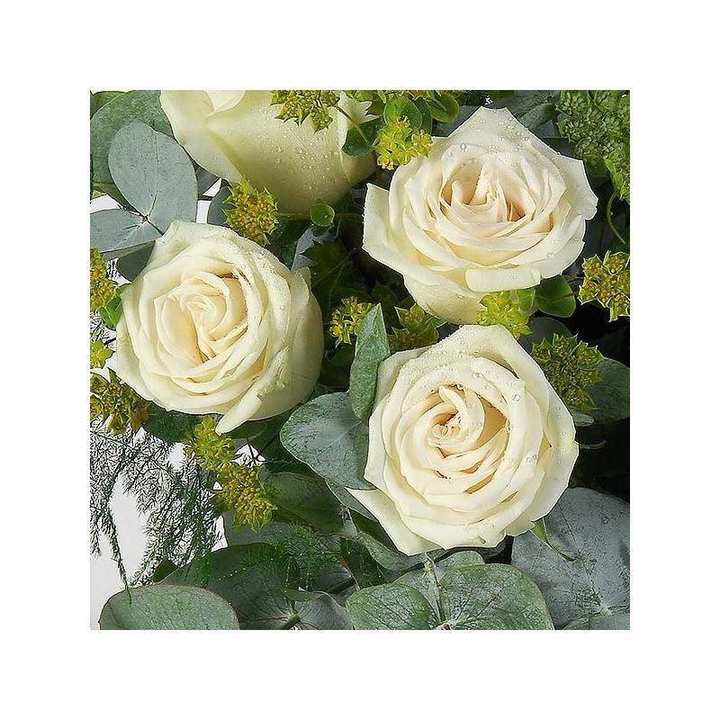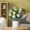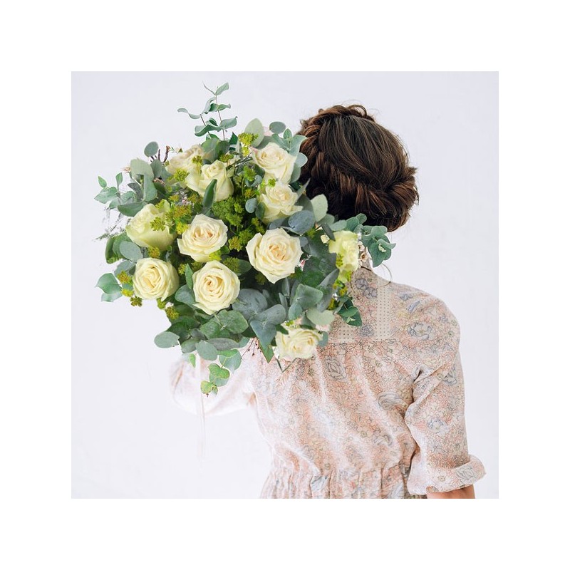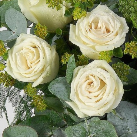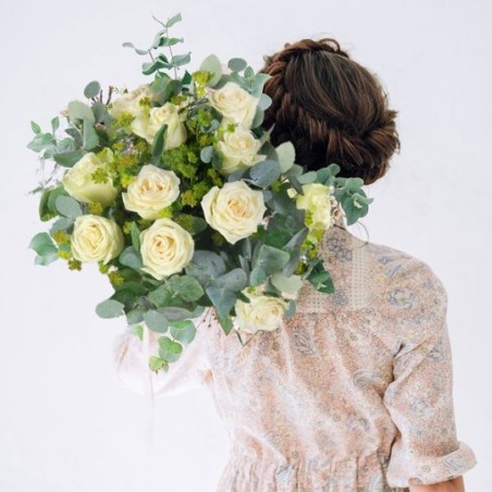 Bouquet dans les tons ivoire et verts composé d'avalanches, le tout accompagné de feuillage d'eucalyptus.