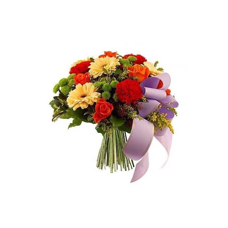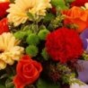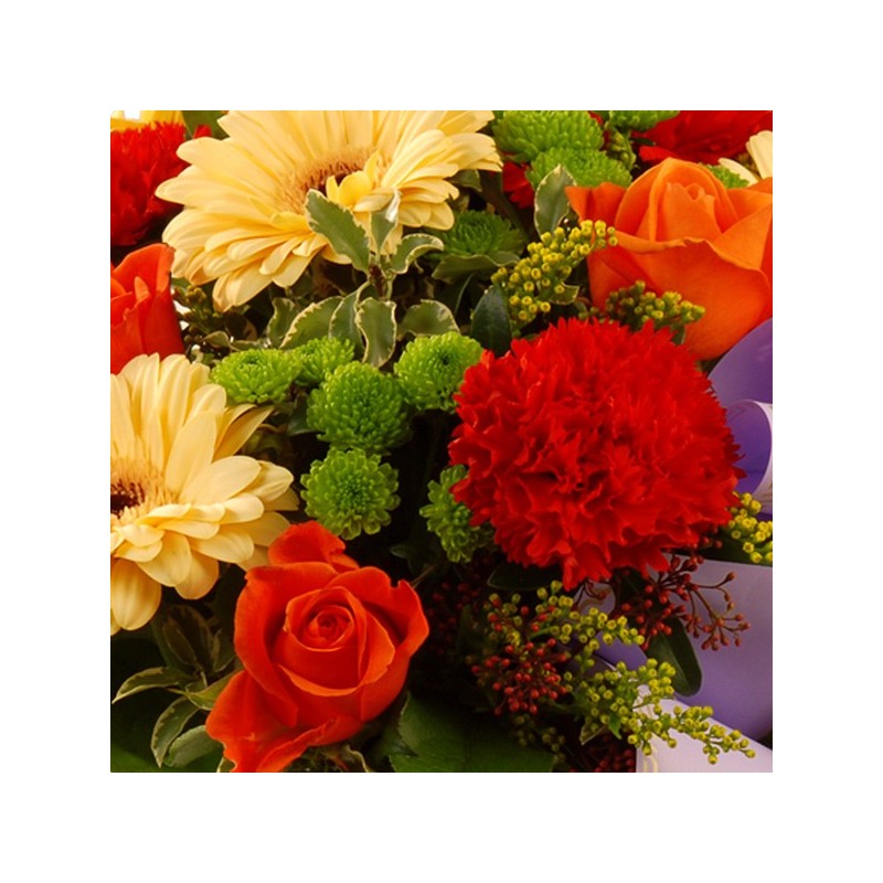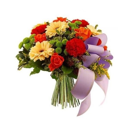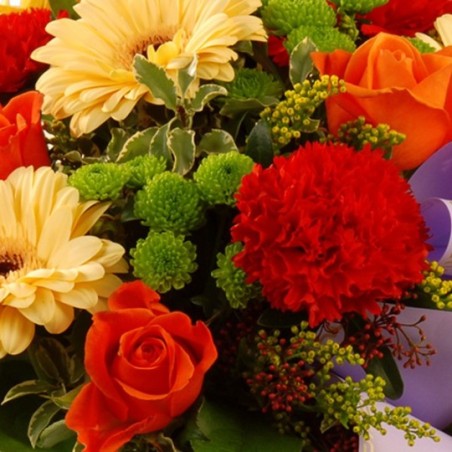 Bouquet de deuil dans les tons rouge et orange composé de roses, germinis, œillets rouges et autres fleurs agrémenté d'un nœud mauve.