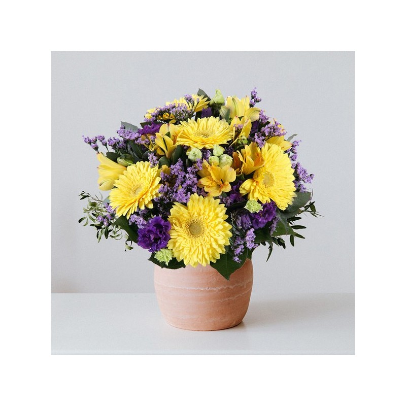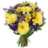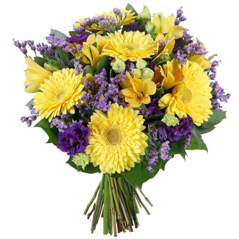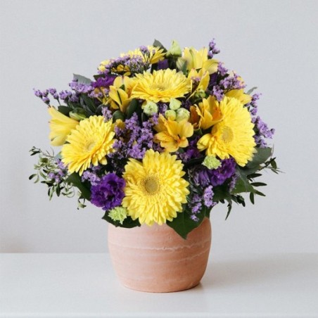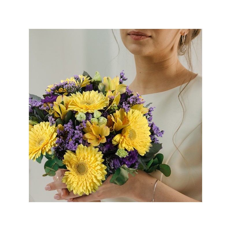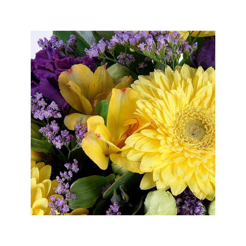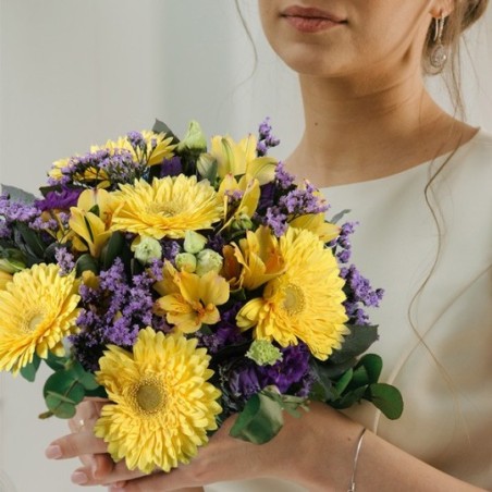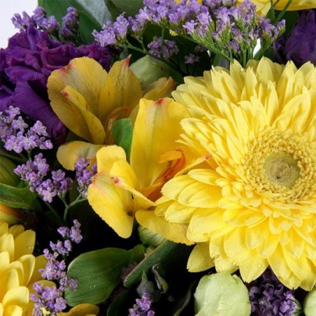 Bouquet rond dans les tons violet et jaune composé de gerberas, lysianthus, alstromerias et feuillage.