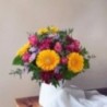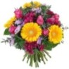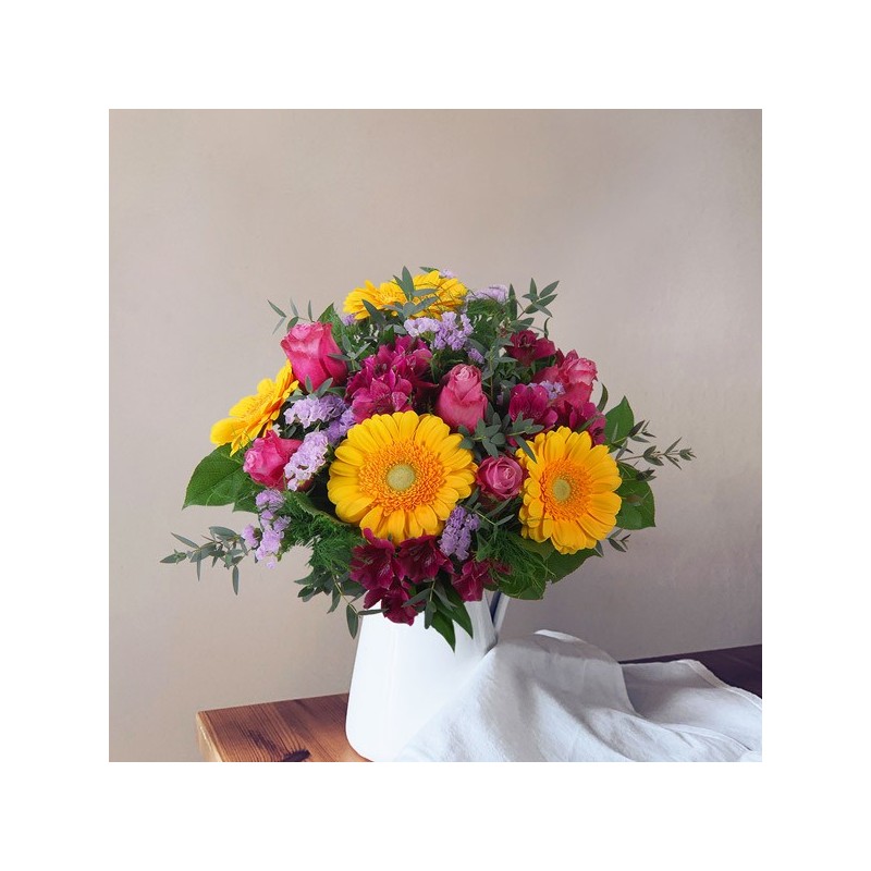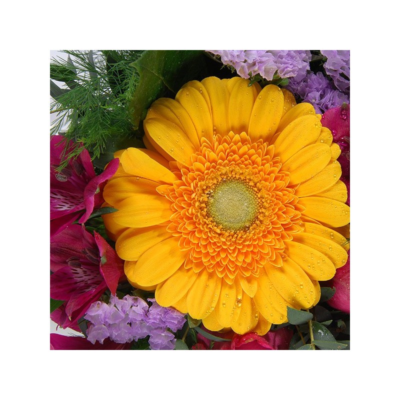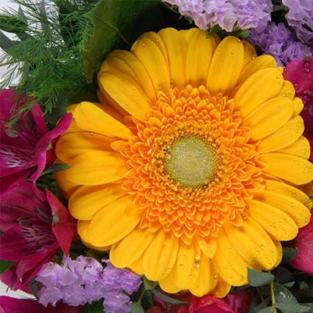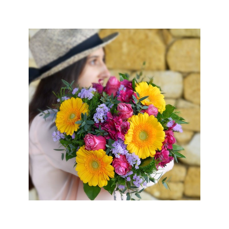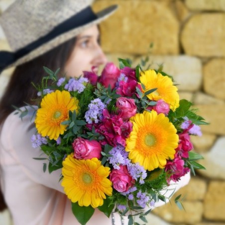 Bouquet rond dans les tons jaune, rose et violet, composé de gerberas, roses, fleurettes de saison et feuillages.