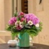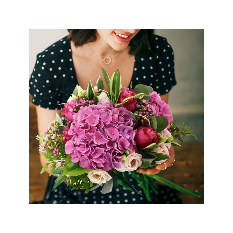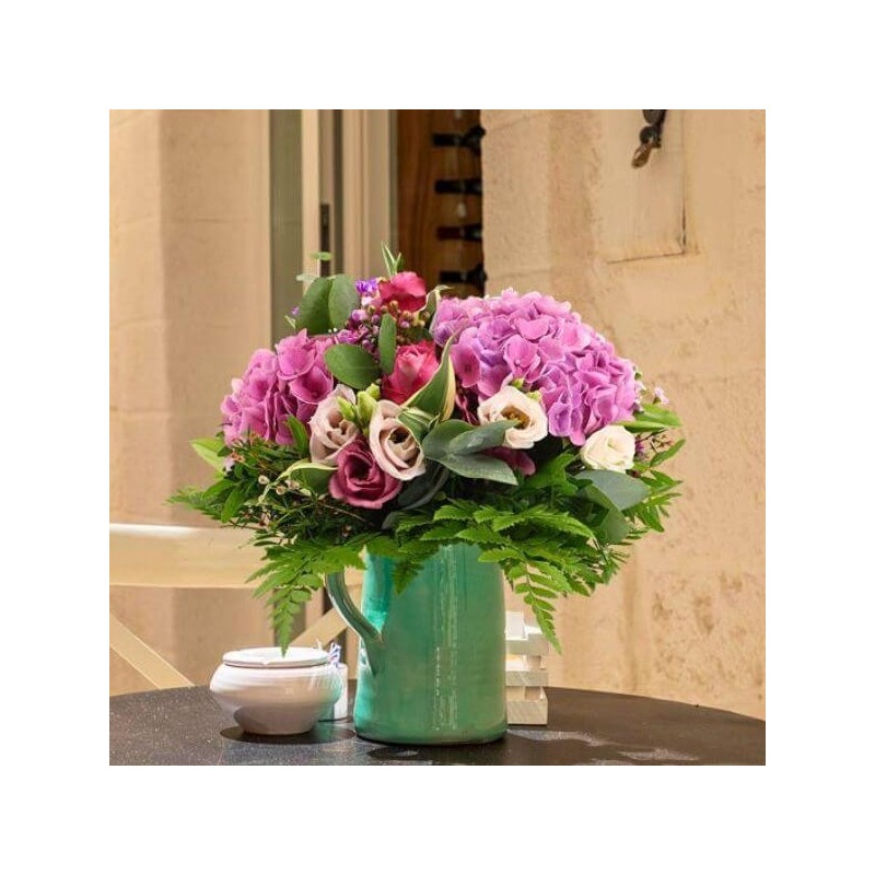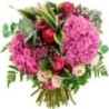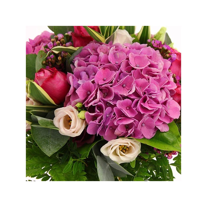Bouquet estival dans les tons roses composé d'hortensias roses de roses fuchsias de lisianthus et autres fleurettes de saison et feuillage.