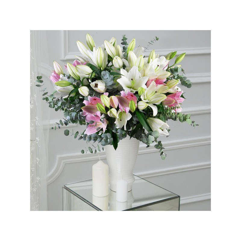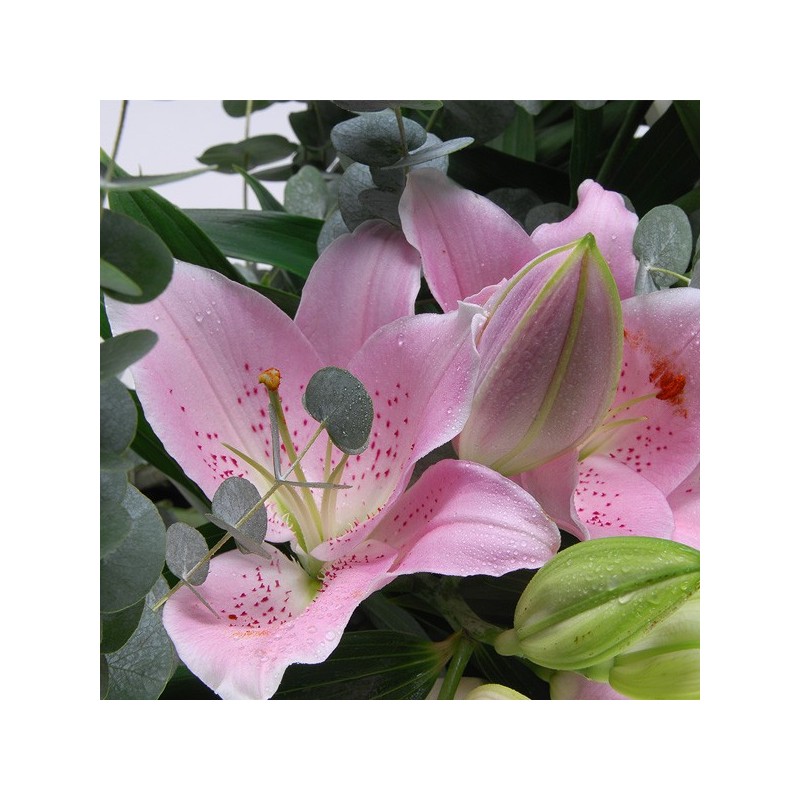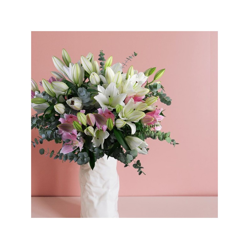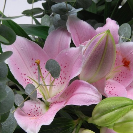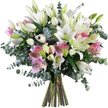 Bouquet rond dans les tons blanc et rose composé de lys et eucalyptus.