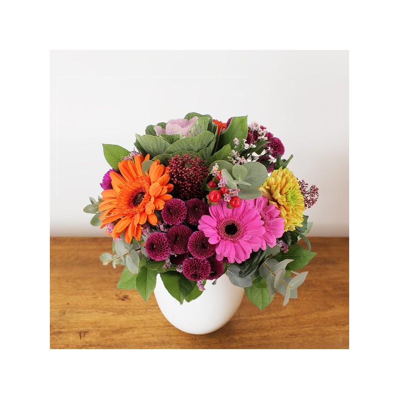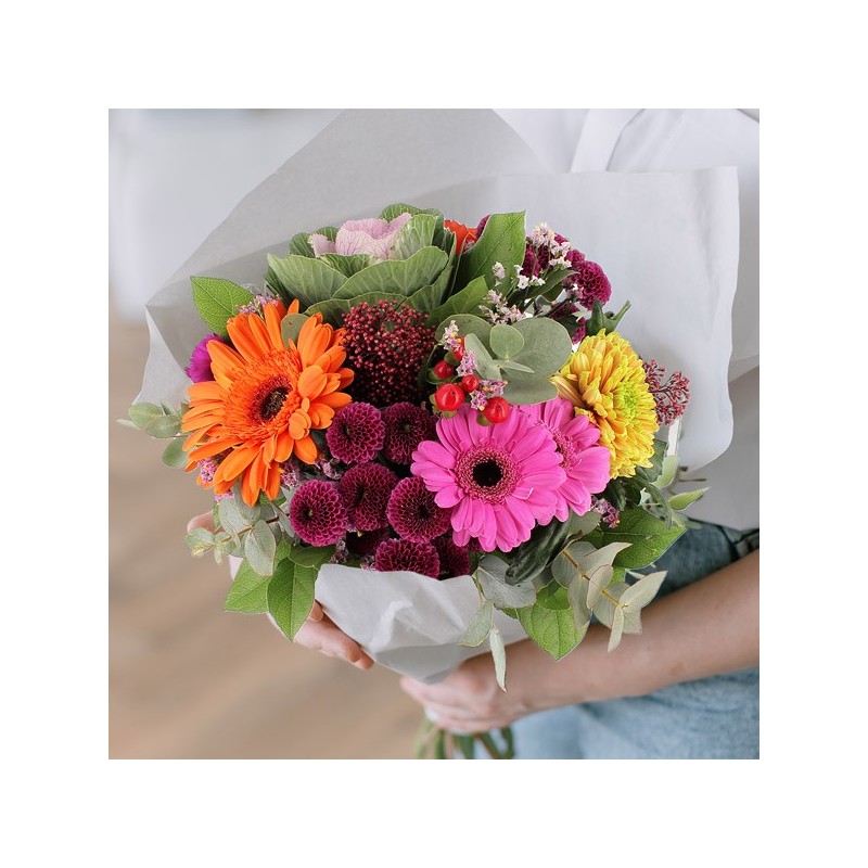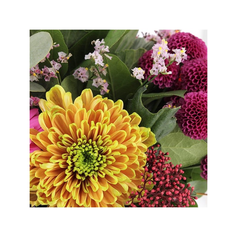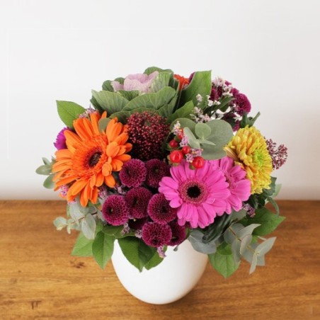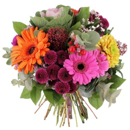 Bouquet rond dans les tons orange, fushias, violet et jaune composé de roses, gerberas, œillets, santinis, fleurettes et feuillages.