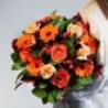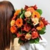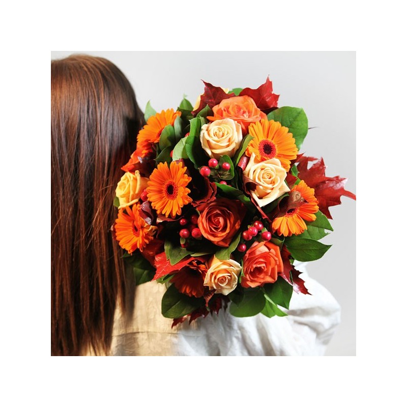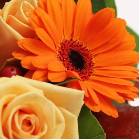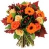 Bouquet rond dans les tons orange, saumon et vert composé de roses, gerberas, hypéricum et feuillages automnal.