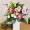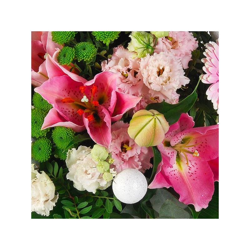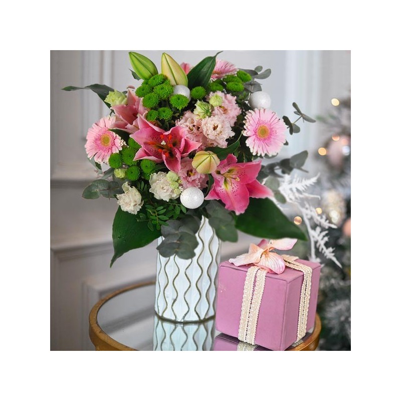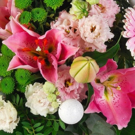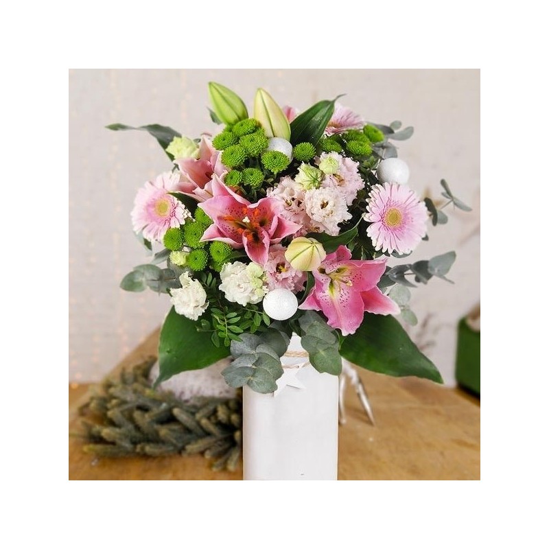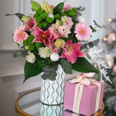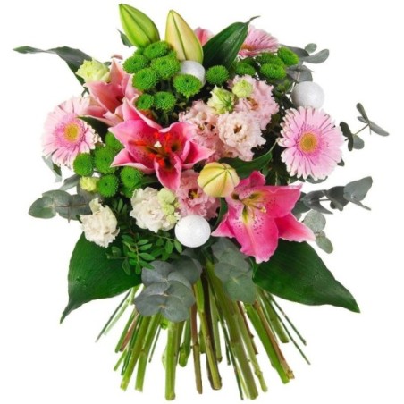 Bouquet longues tiges de Noël dans les tons roses et vert composé de lys, germinis, lisianthus, oeillets et feuillages.