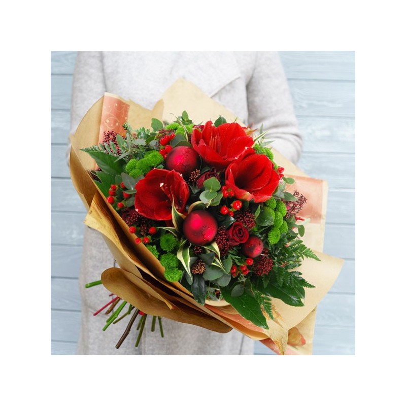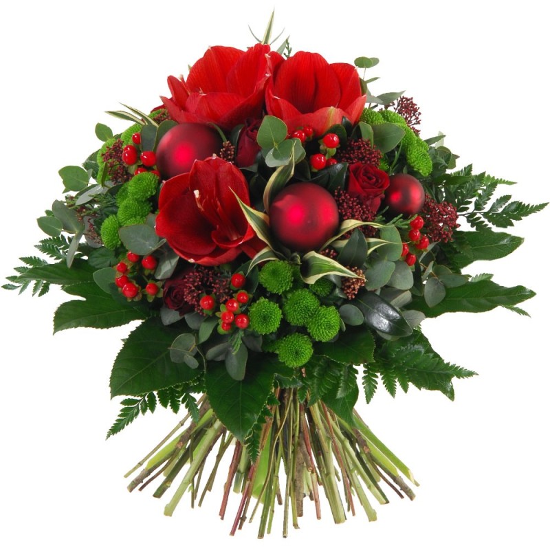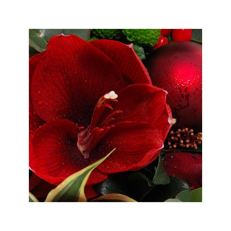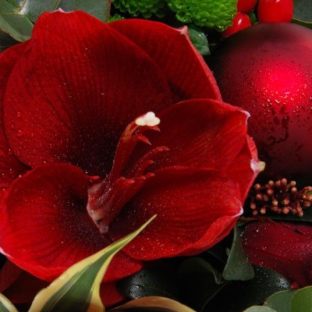 Bouquet rond de Noël dans les tons rouge et vert composé d'amarillys, santini et accompagné de boules de Noël et son feuillage.