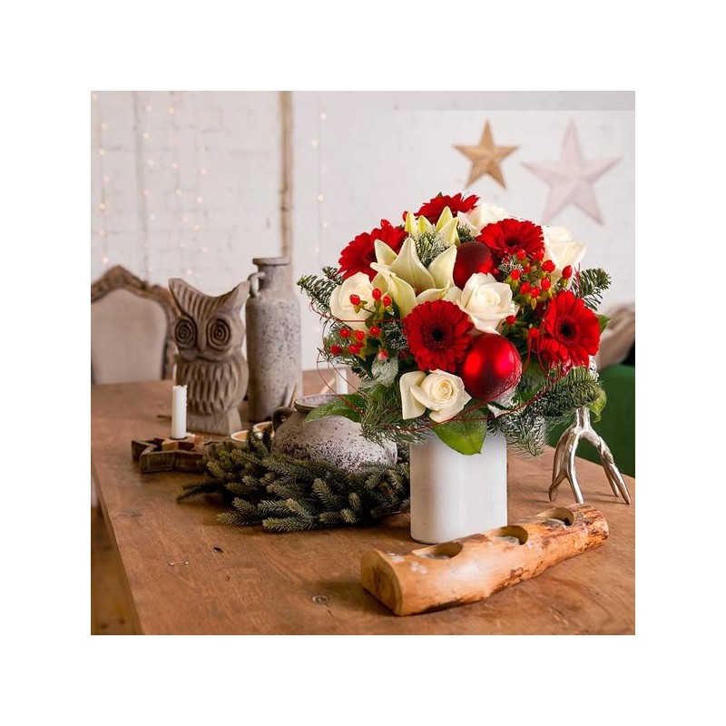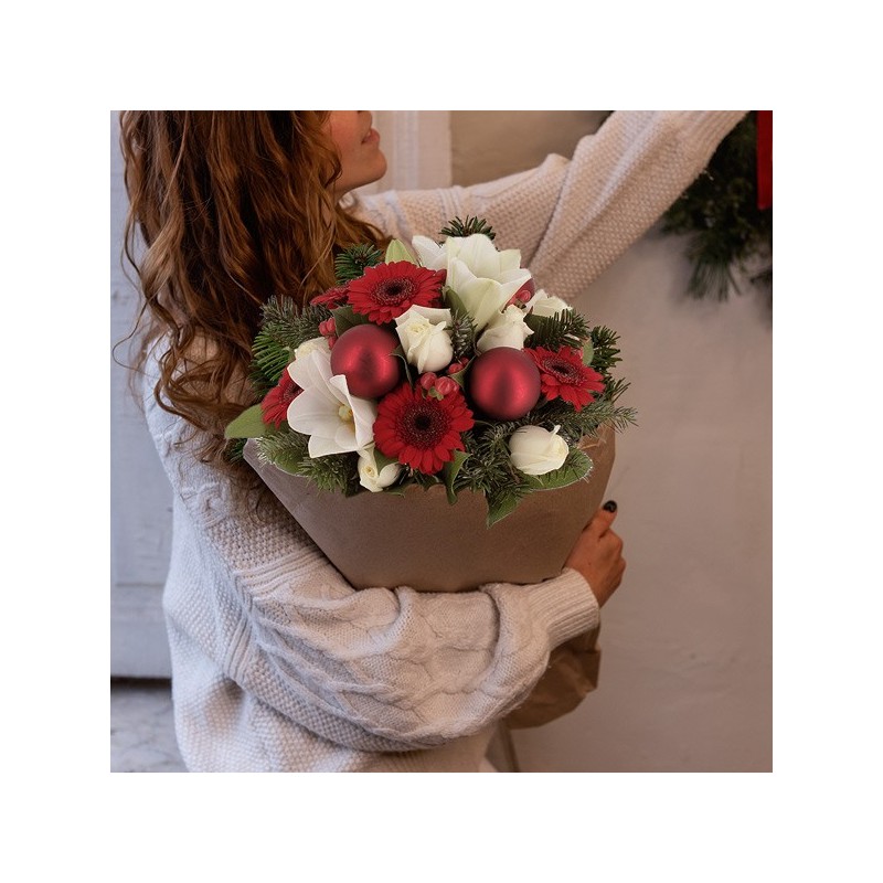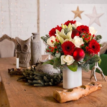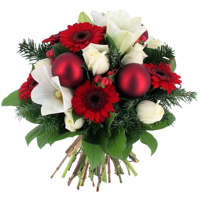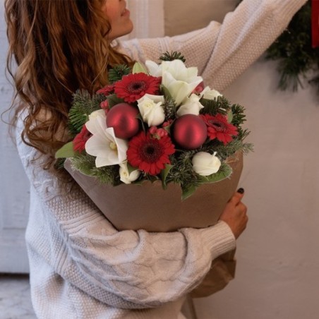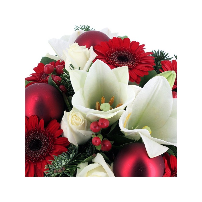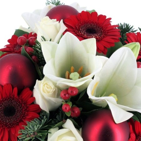Bouquet rond de Noël dans les tons rouge et blanc composé de germinis ,lys et roses accompagné de boules de Noël et de son feuillage.