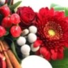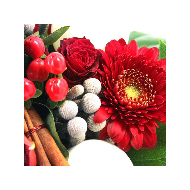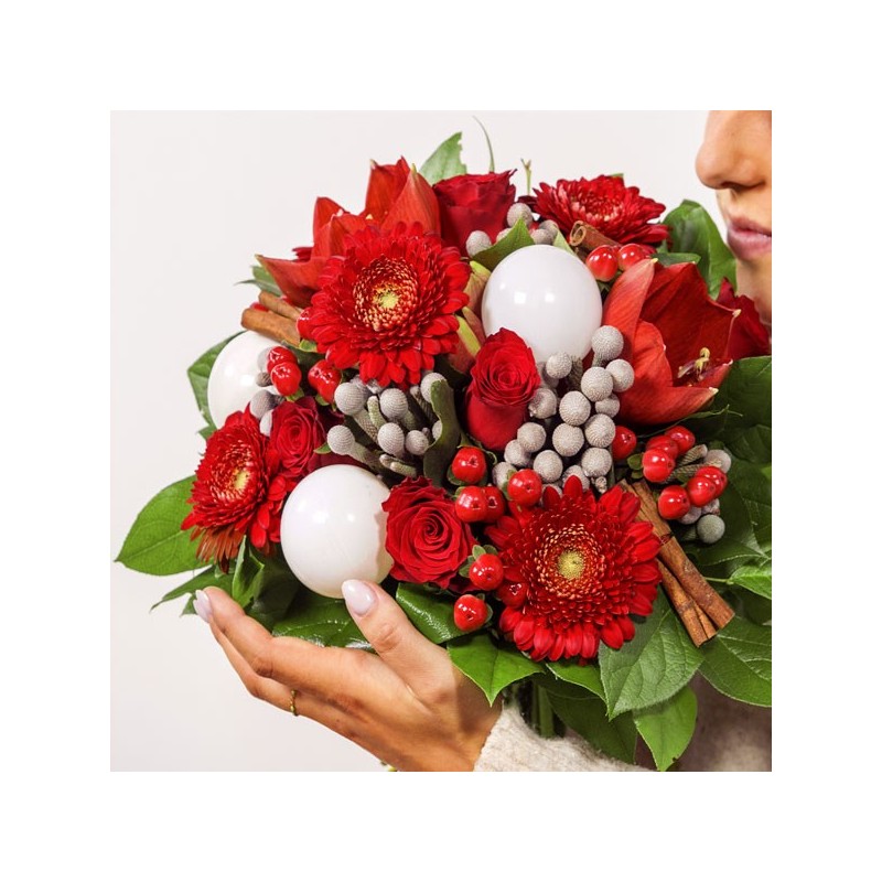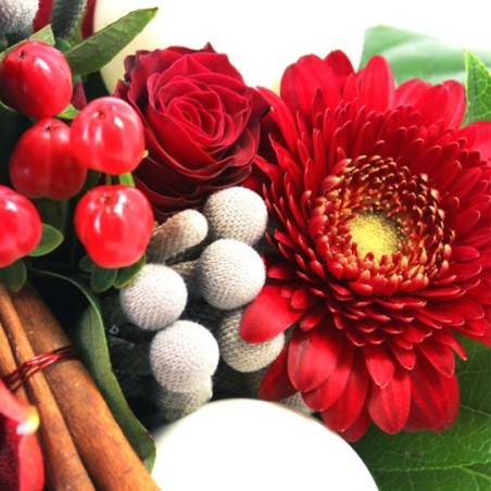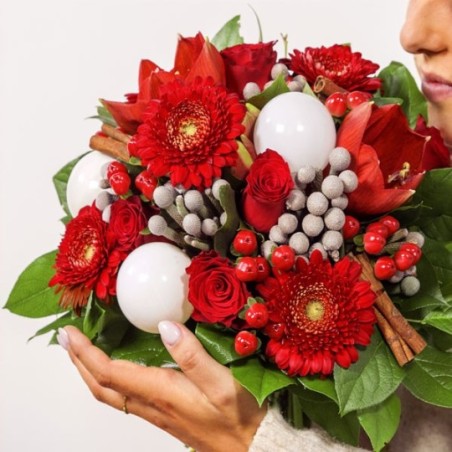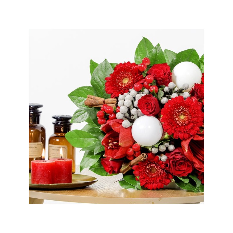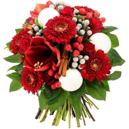 Bouquet de Noël dans les tons rouges et blancs composé de germinis, roses et amaryllis accompagné de décorations de Noël et de feuillage. La décoration de noël peut varier en fonction de la disponibilité du fleuriste en charge de votre commande.