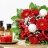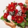 Bouquet de Noël dans les tons rouges et blancs composé de germinis, roses et amaryllis accompagné de décorations de Noël et de feuillage. La décora...