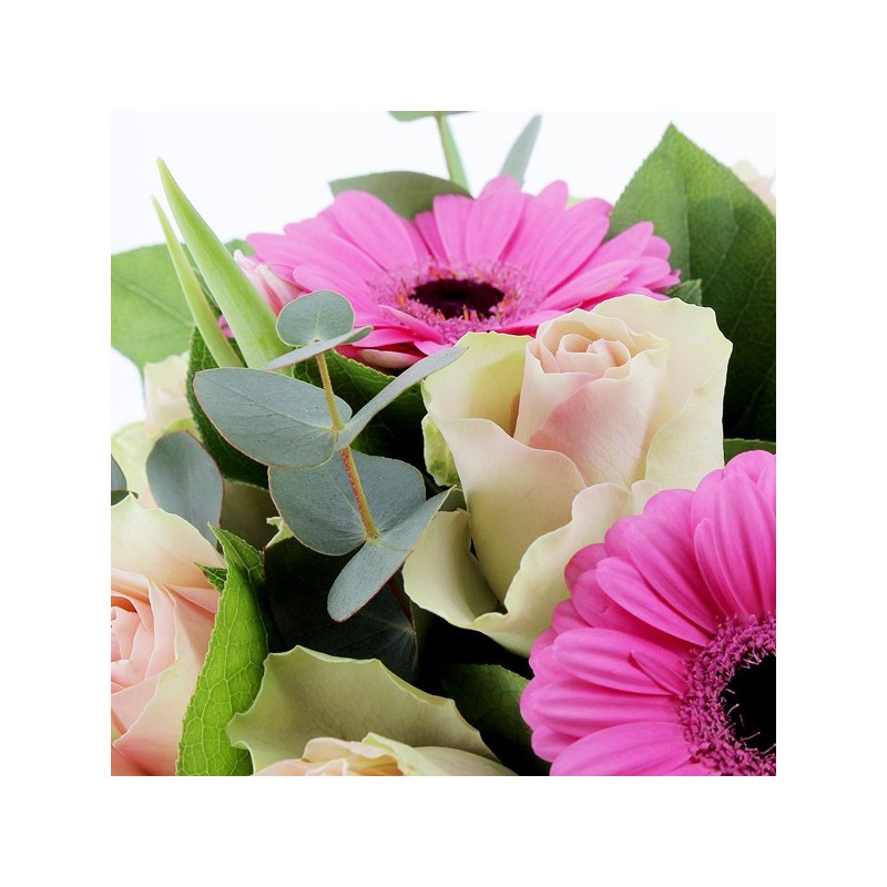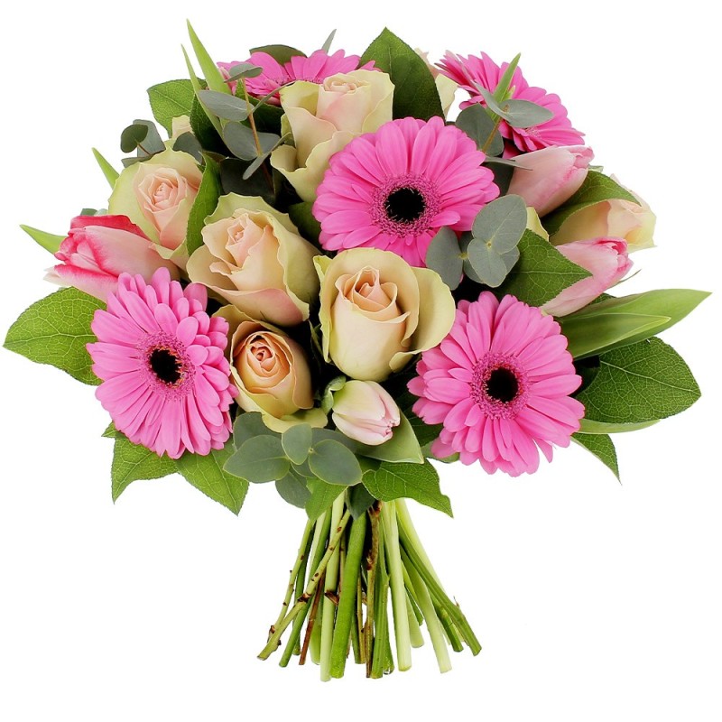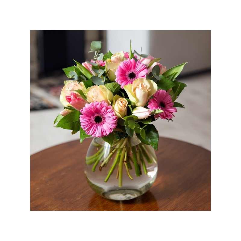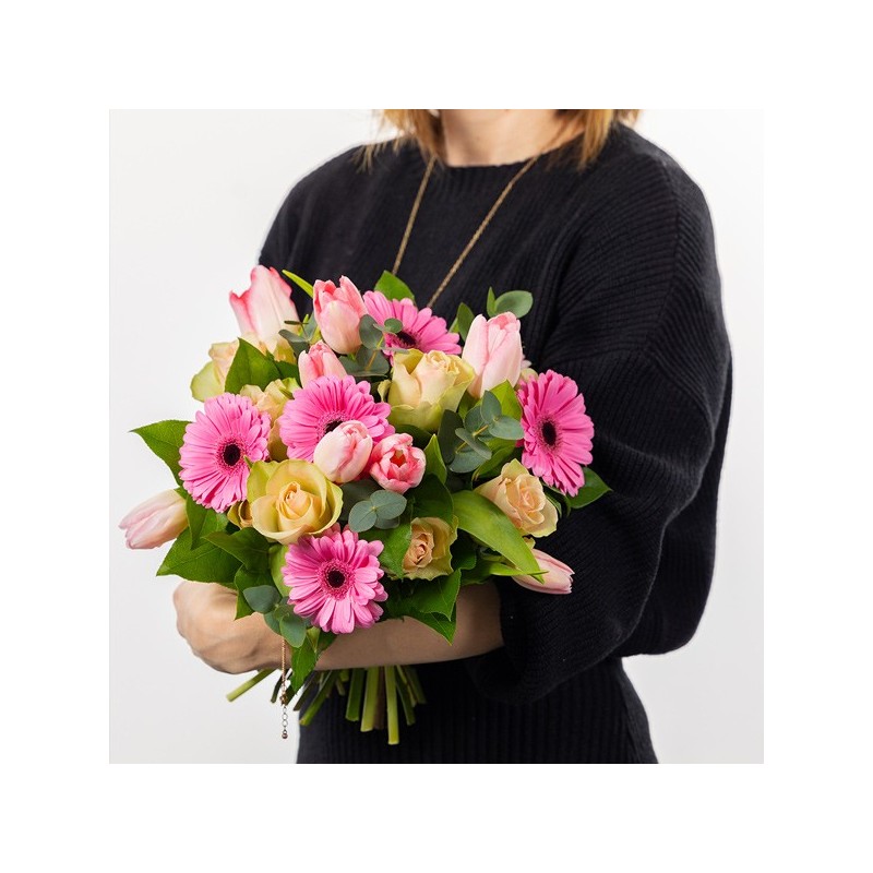 Bouquet rond dans les tons de rose composé de germinis, roses, tulipes et autres fleurs de saison, accompagné d'un feuillage discret.