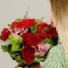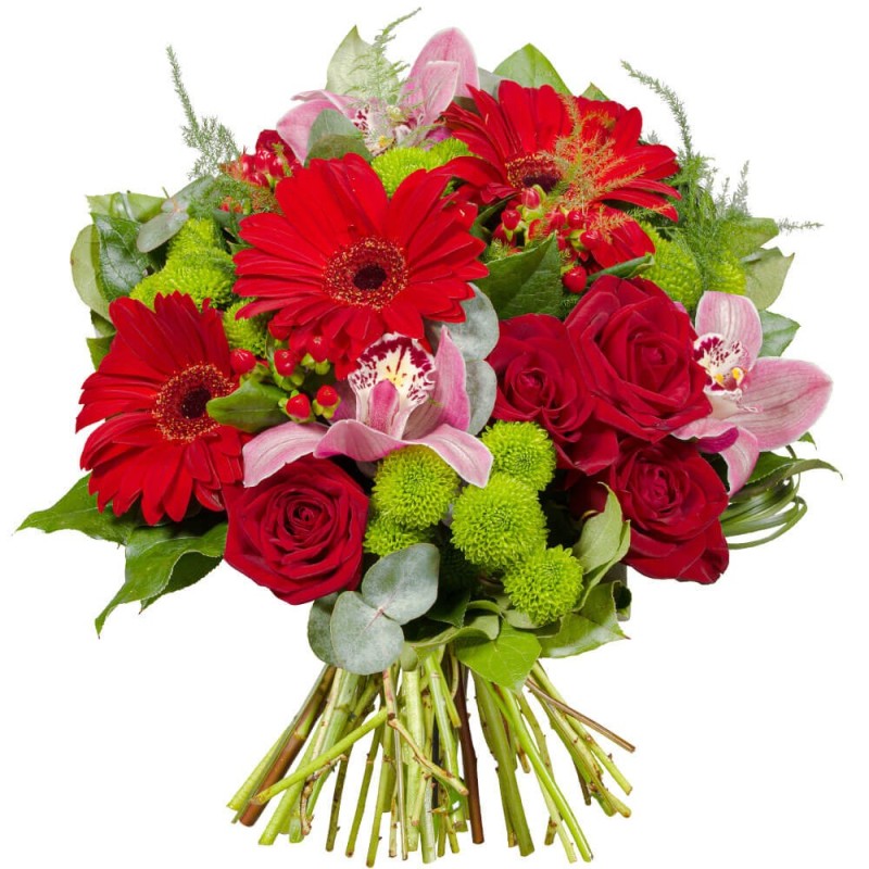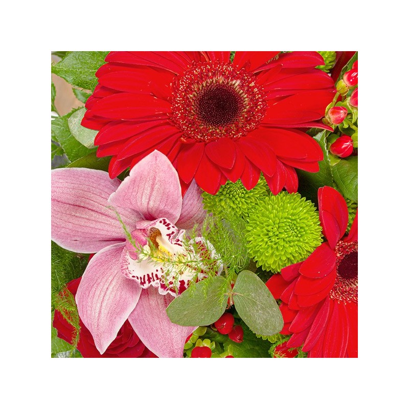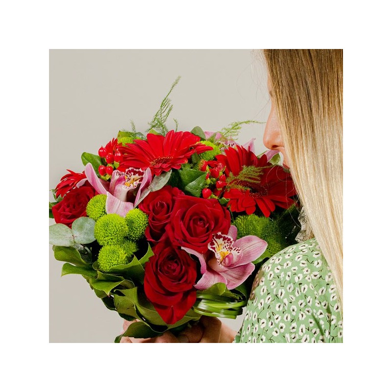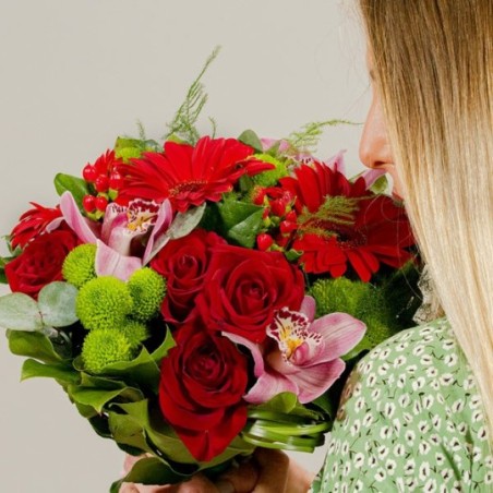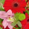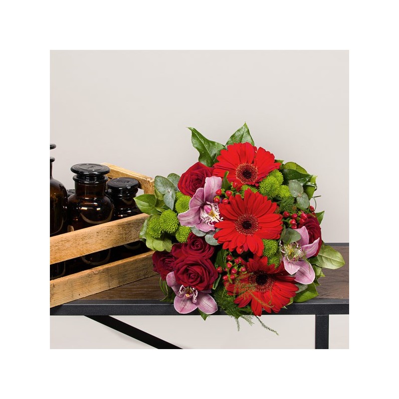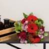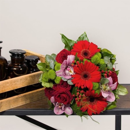 Bouquet rond dans les tons rouges composé de gerberas, roses et autres fleurs de saison, le tout accompagné de feuillage.
