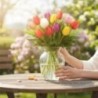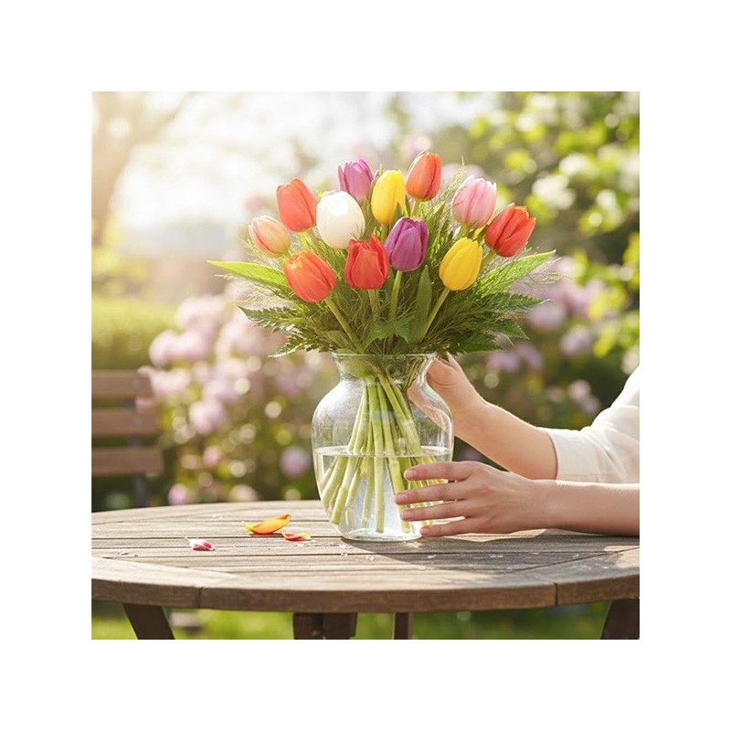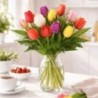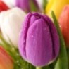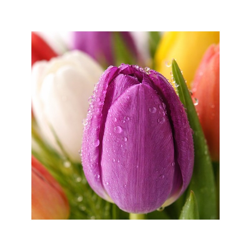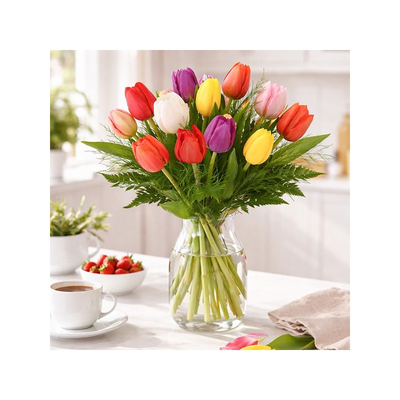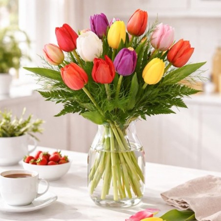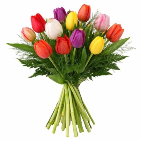 Bouquet multicolore composé de tulipes et feuillage.