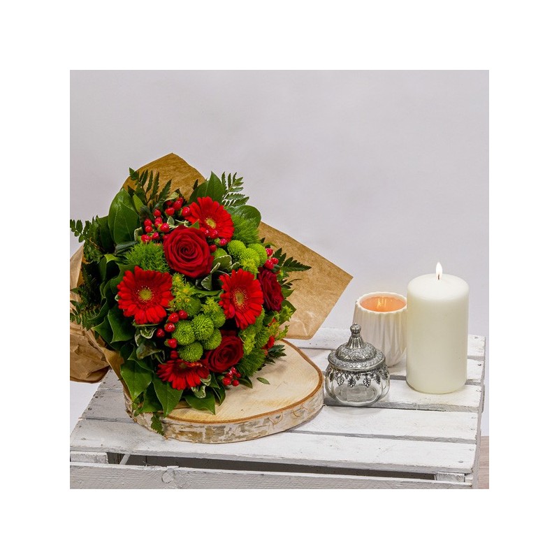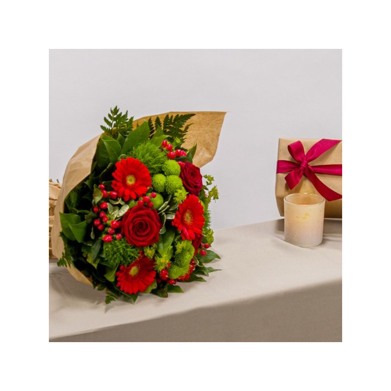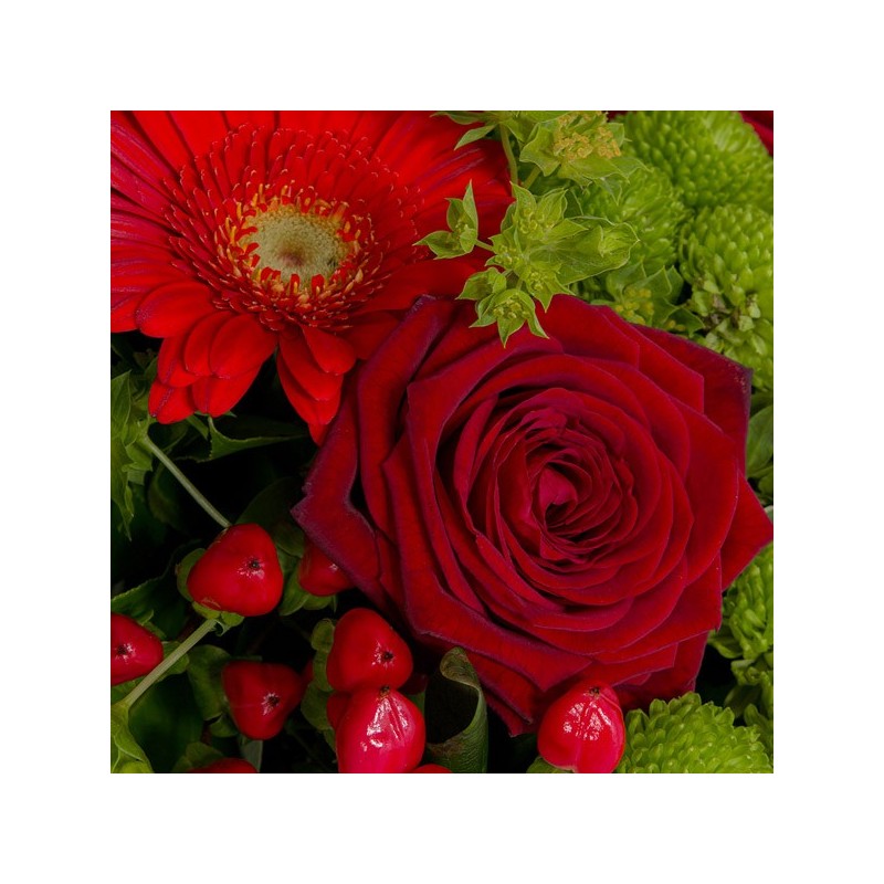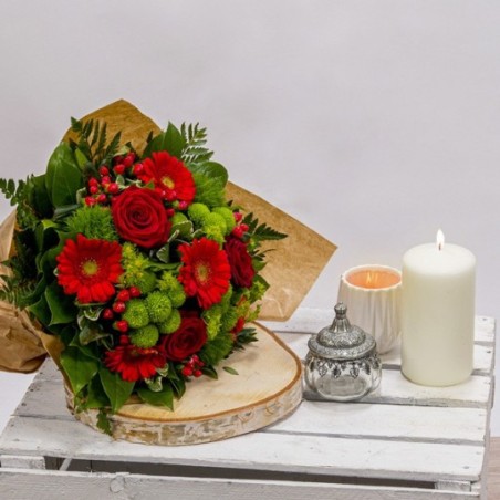 Bouquet rond dans les tons rouge et vert composé de gerberas, roses et autres fleurs de saison.