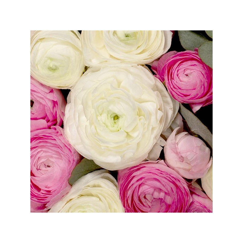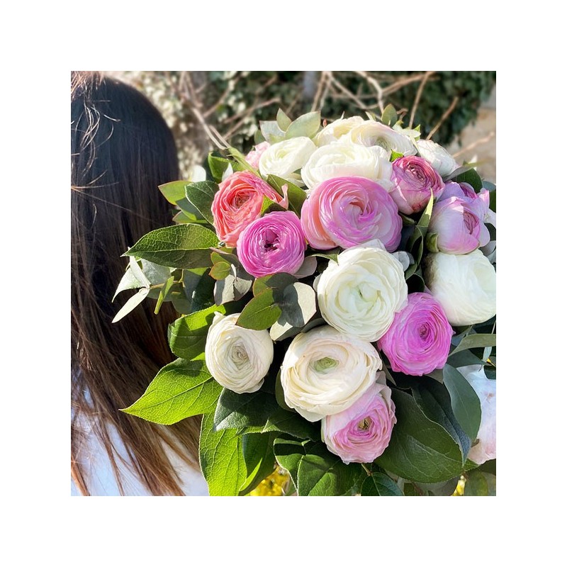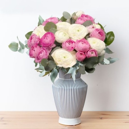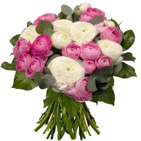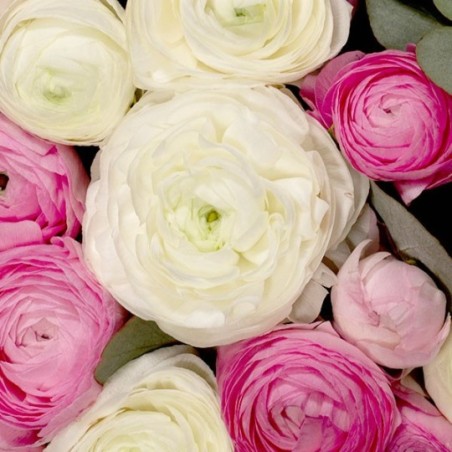 Bouquet de renoncules dans les tons roses et blancs accompagné de feuillage.