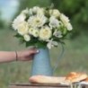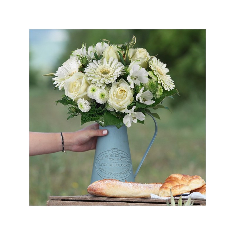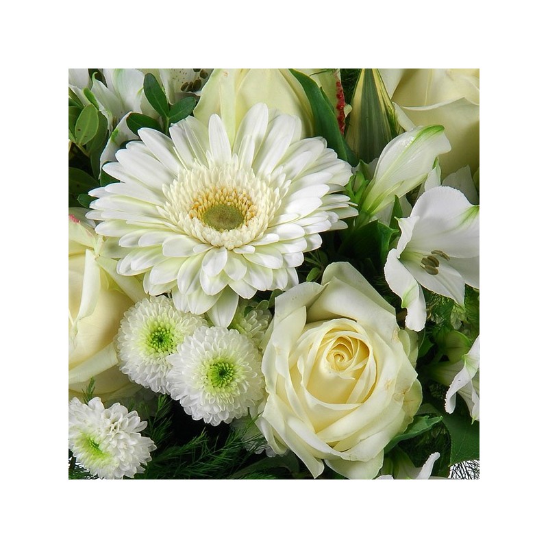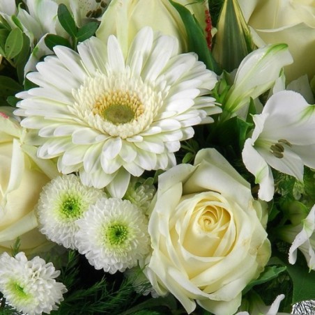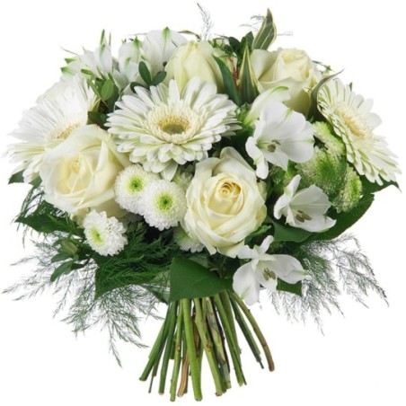 Bouquet dans les tons blancs composé de de roses, gerberas et autres fleurs de saison, le tout accompagné de feuillage.