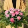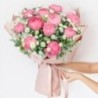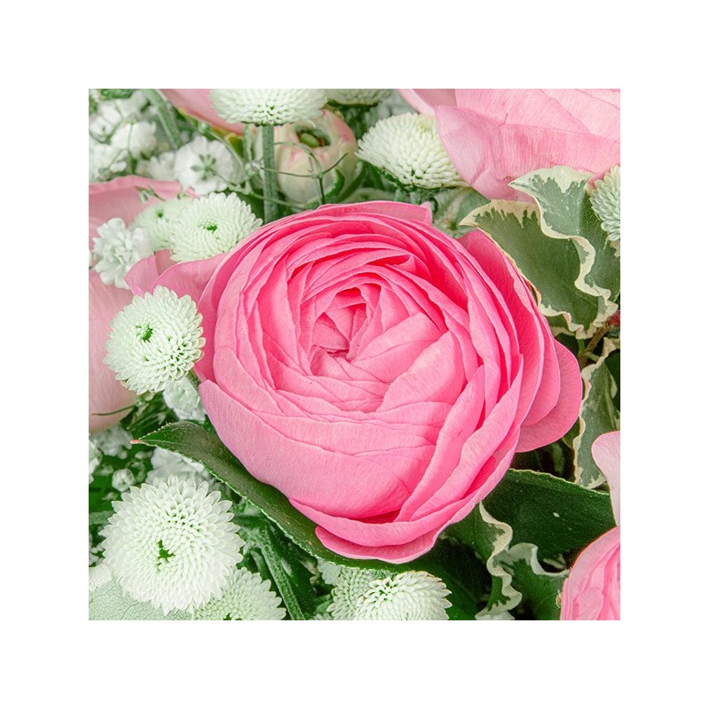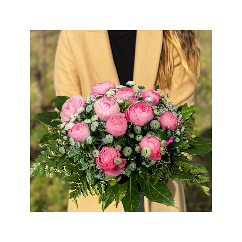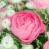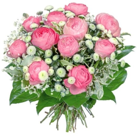Bouquet rond dans les tons rose et blanc composé de renoncules roses, de fleurettes blanches, et d'une collerette de feuillages.