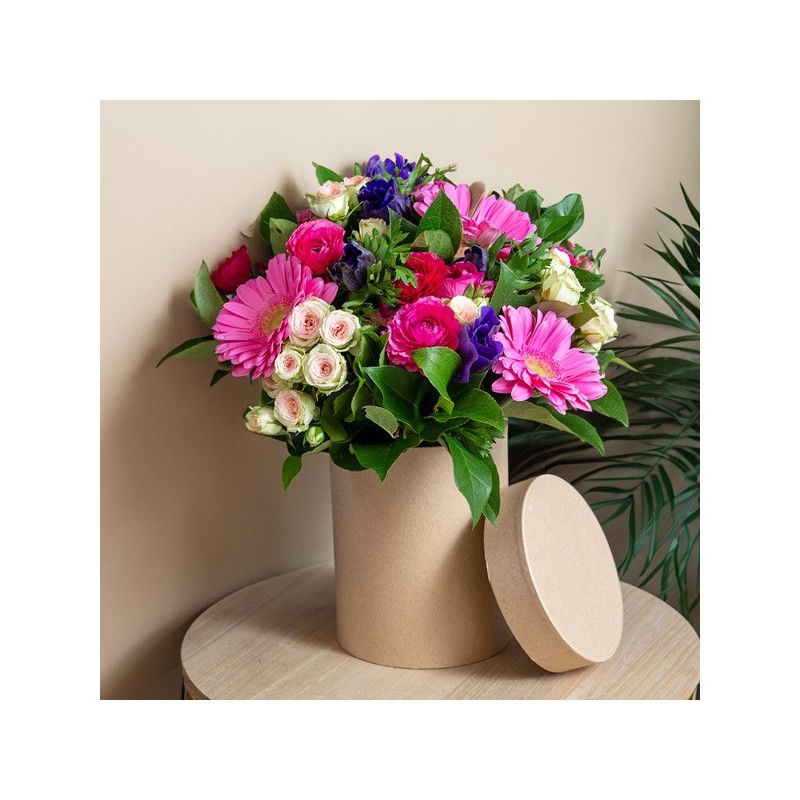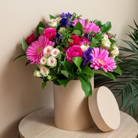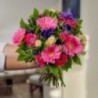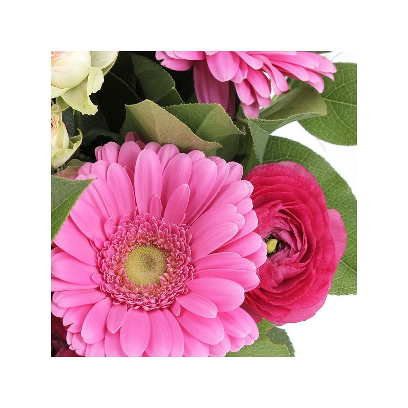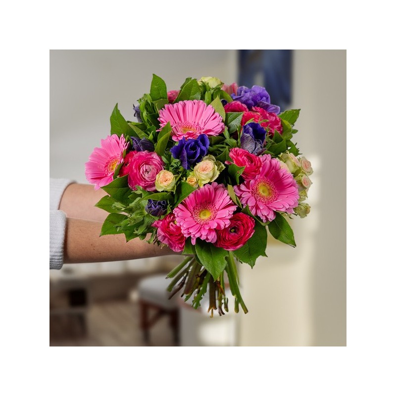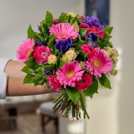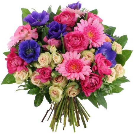 Bouquet rond dans les tons fuchsia, crème, rose pale et bleu composé de fleurs de saison, de roses branchues, et de gerberas rose (les anémones et les renoncules peuvent être remplacées en fonction de la saison), avec une collerette de feuillage.