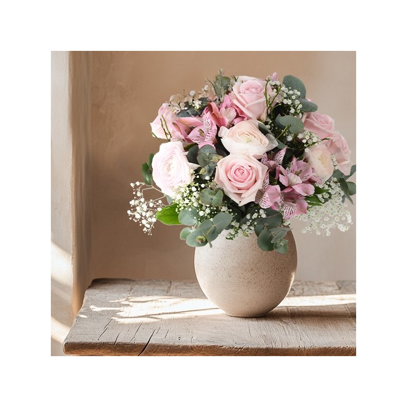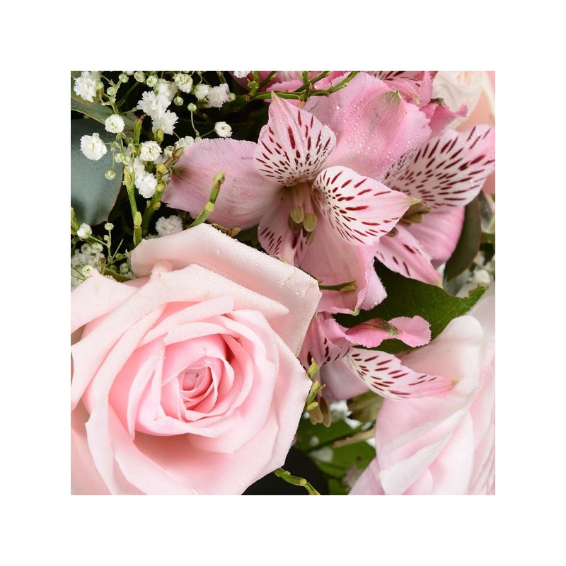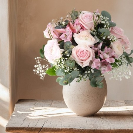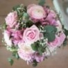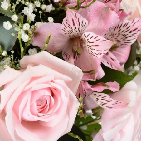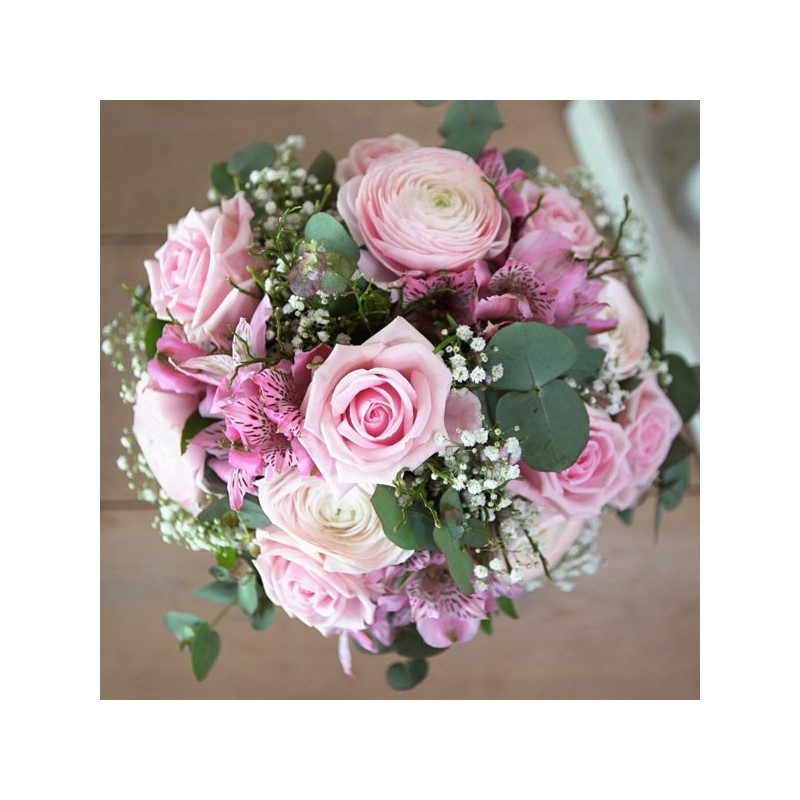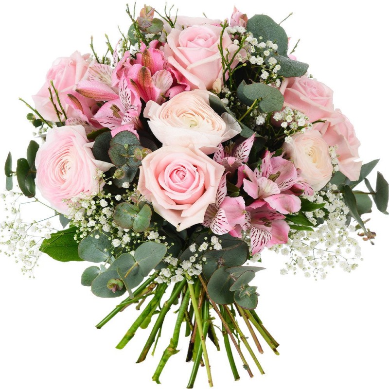 Bouquet dans les tons roses composé de renoncules, gypsophilen roses et alstromerias, accompagné de feuillage.