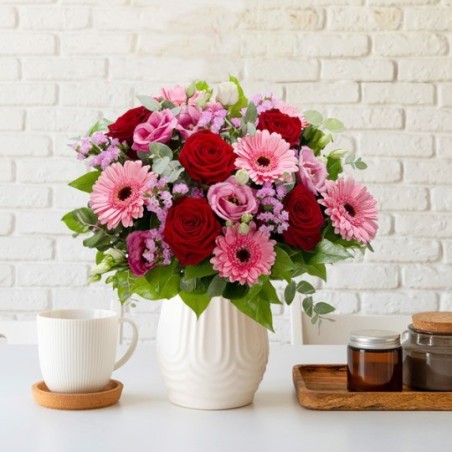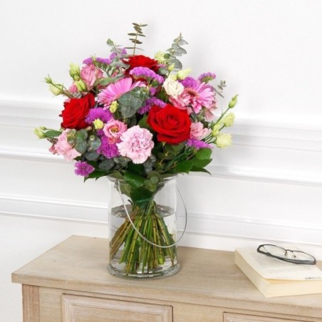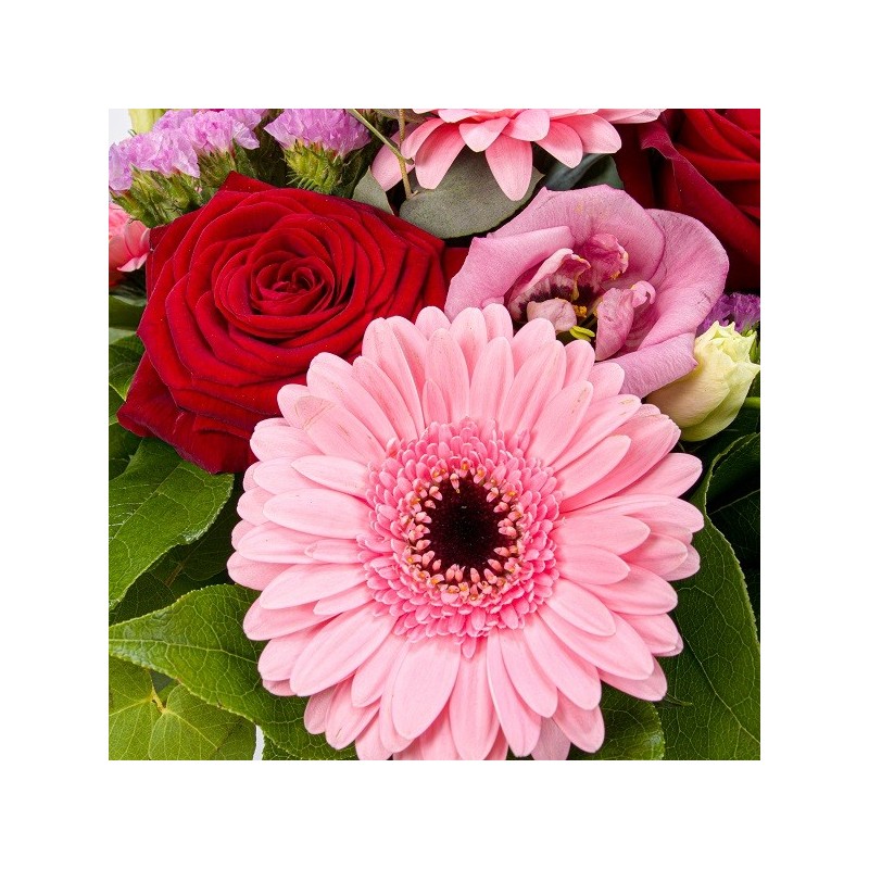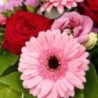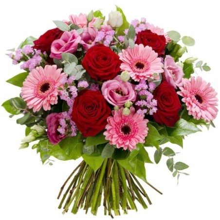 Bouquet rond composé de roses rouges, de germinis roses, d'eucalyptus.