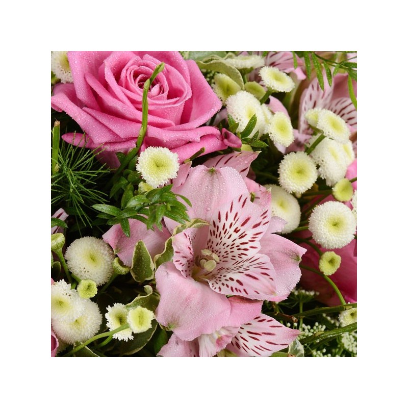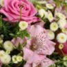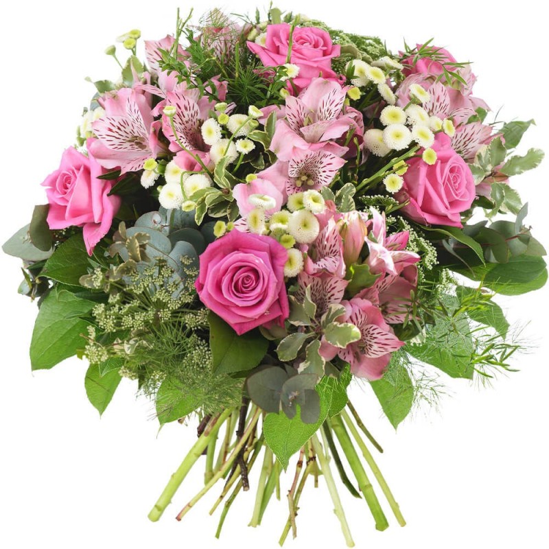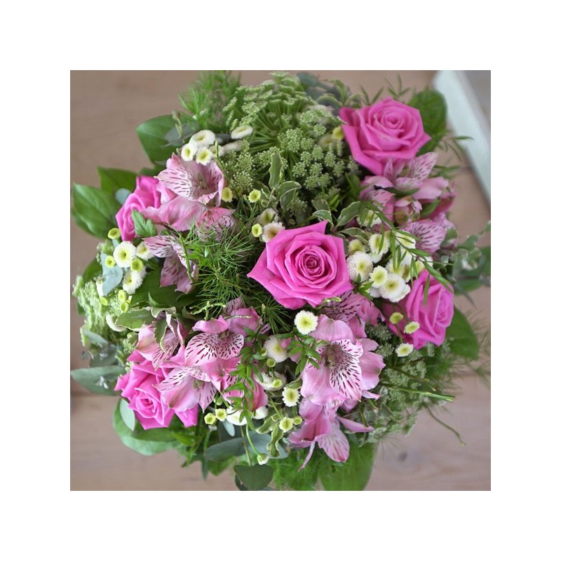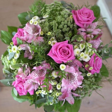 Bouquet dans les tons roses composé de roses, matricaires, dills et alstromerias, le tout accompagné de feuillage.