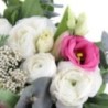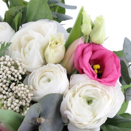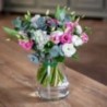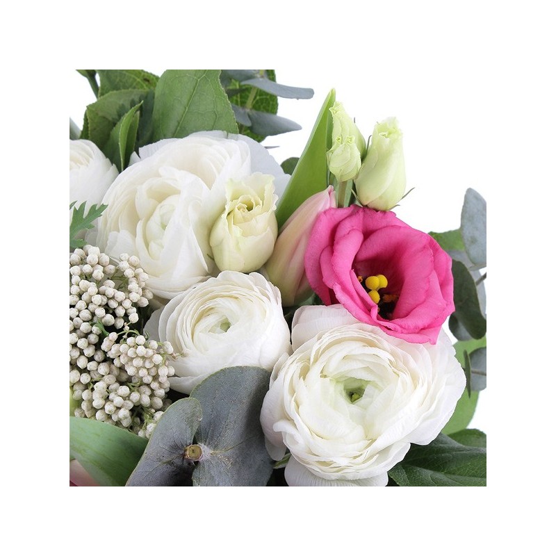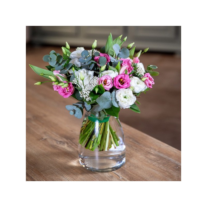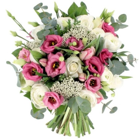 Bouquet composé de tulipes, lisanthus et roses. Agrémenté de feuillages et d'eucalyptus.