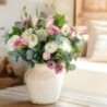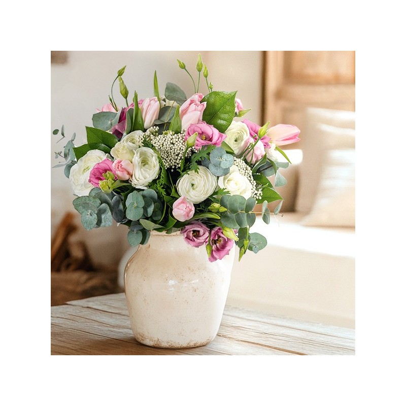 Bouquet composé de tulipes, lisianthus et roses. Agrémenté de feuillages et d'eucalyptus.