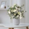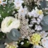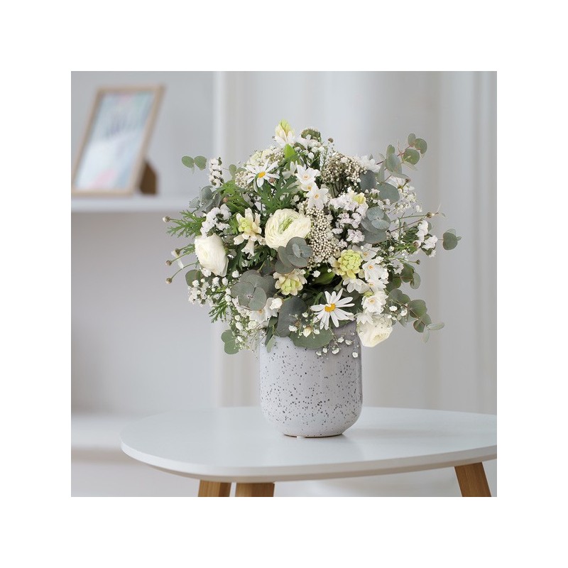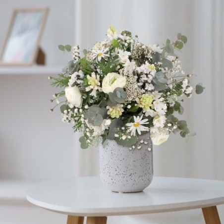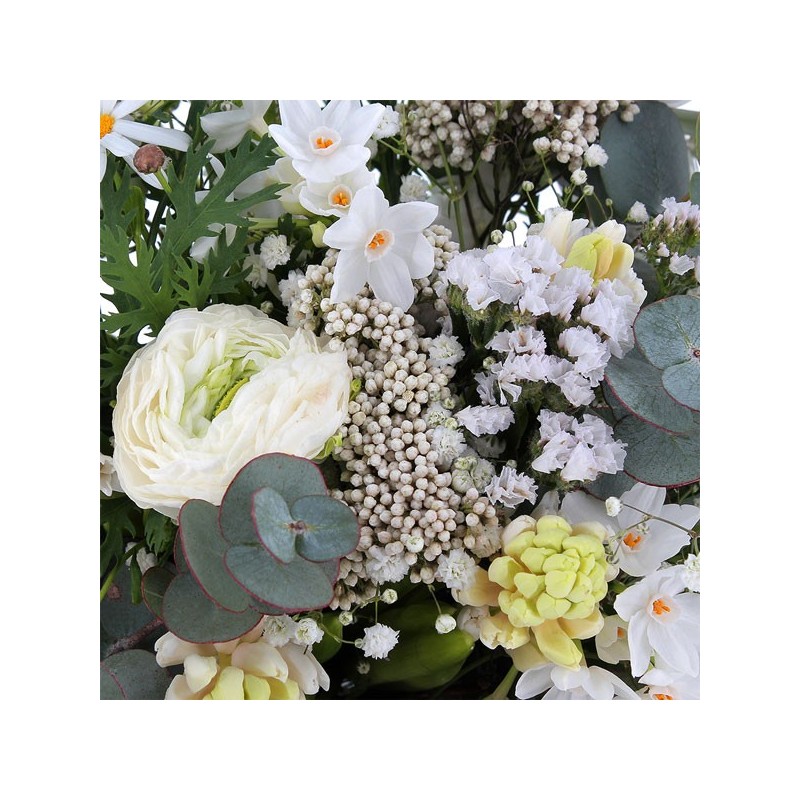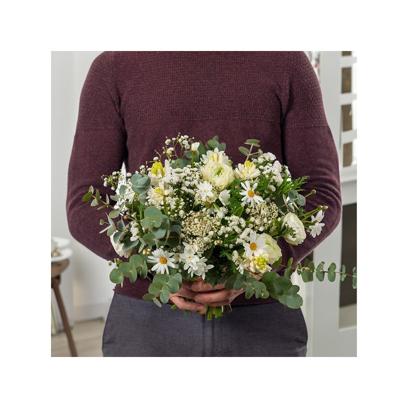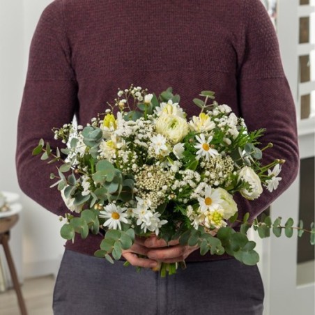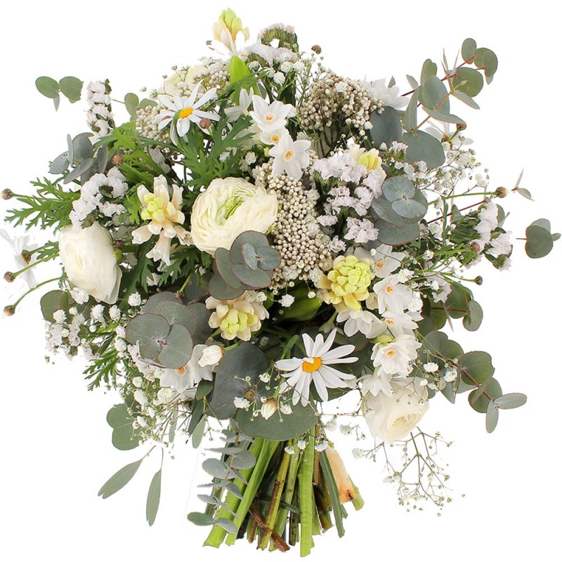 Bouquet champêtre dans les tons blancs composé de renoncules, jacinthes, marguerites, eucalyptus et fleurettes de saison.