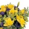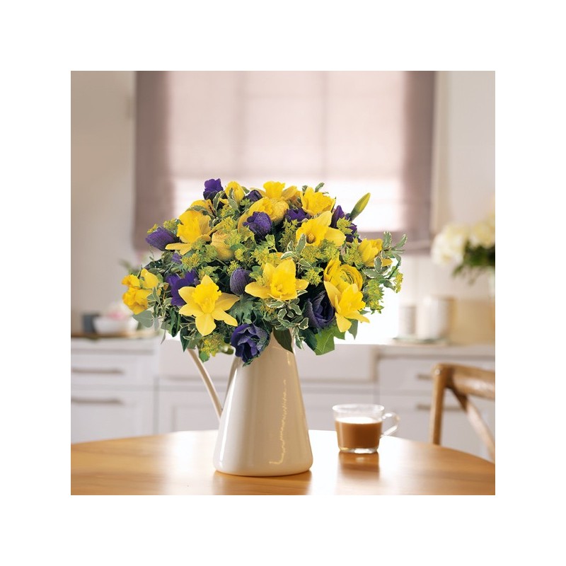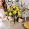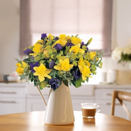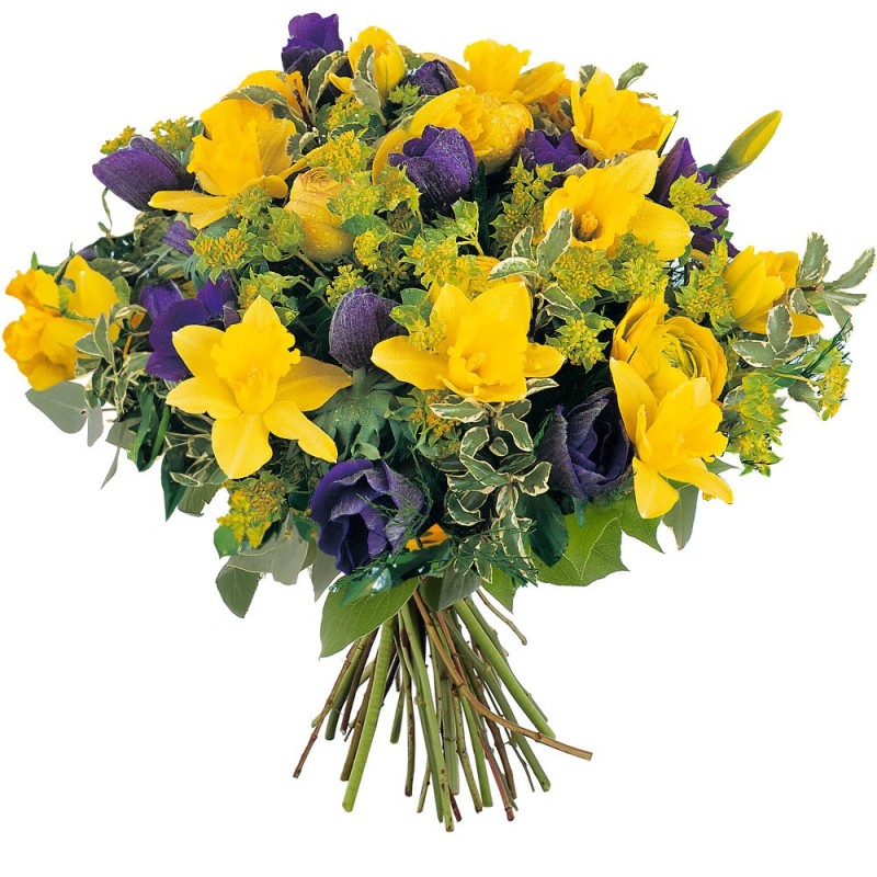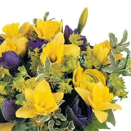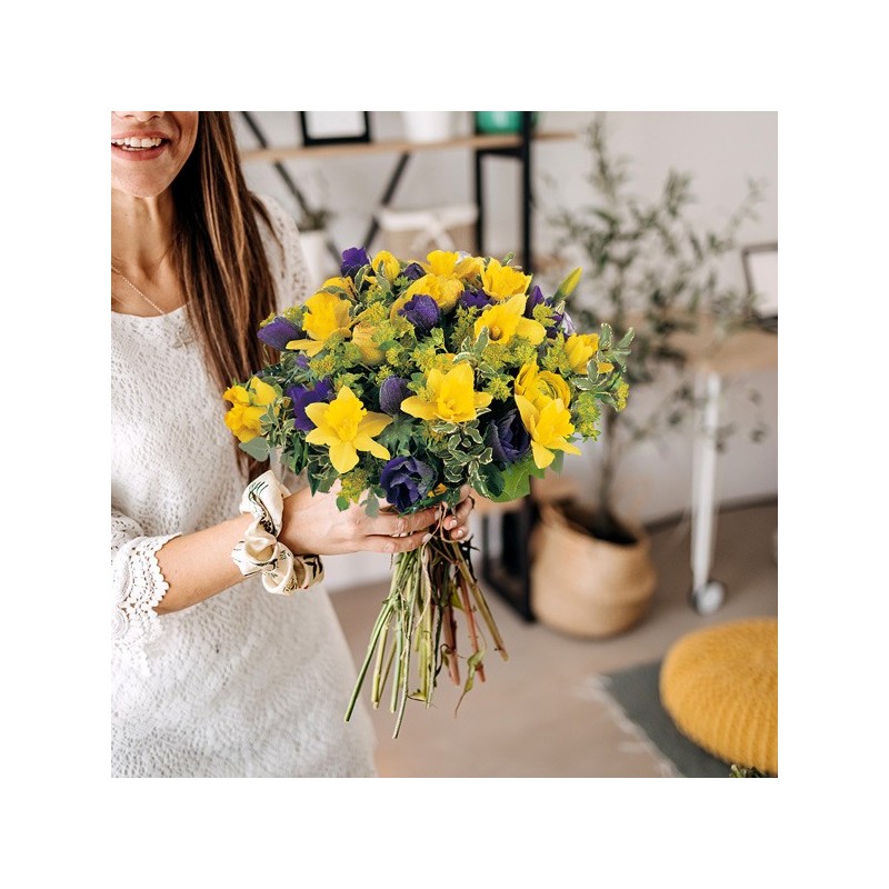 Bouquet dans les tons jaune et violet composé de jonquilles, anémones et feuillage.