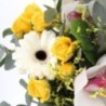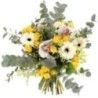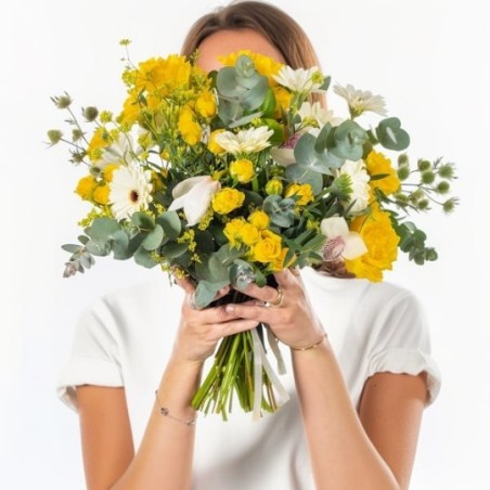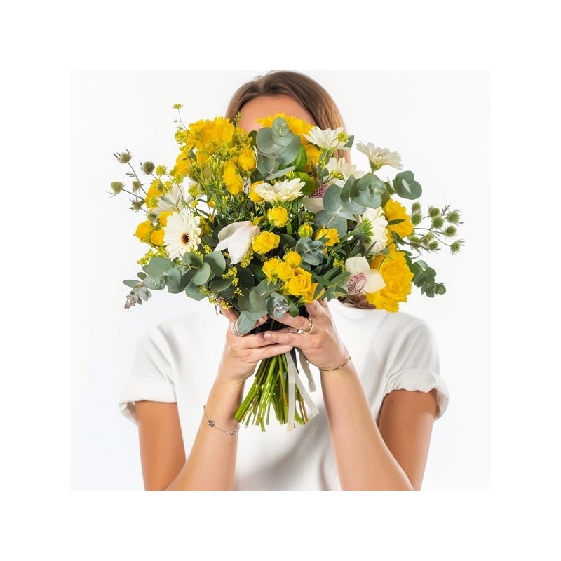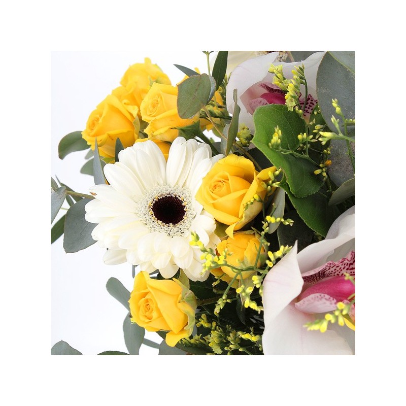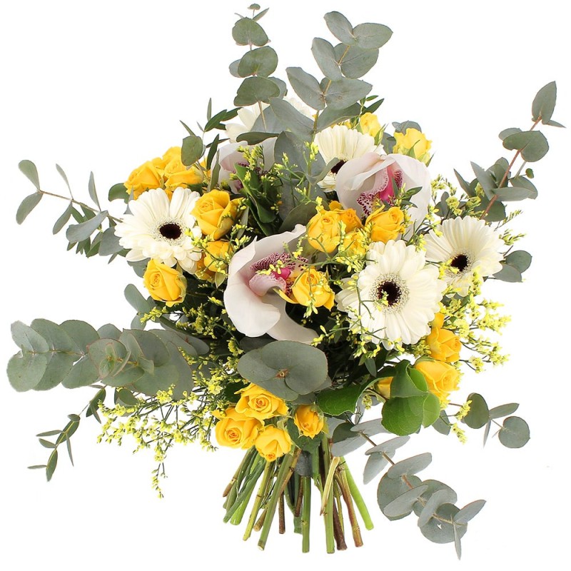 Bouquet dans les tons jaunes et écru composé de roses, germinis, orchidées et fleurs de saison.