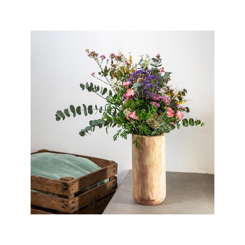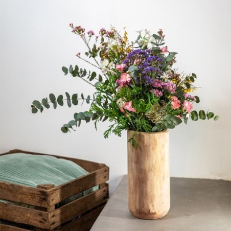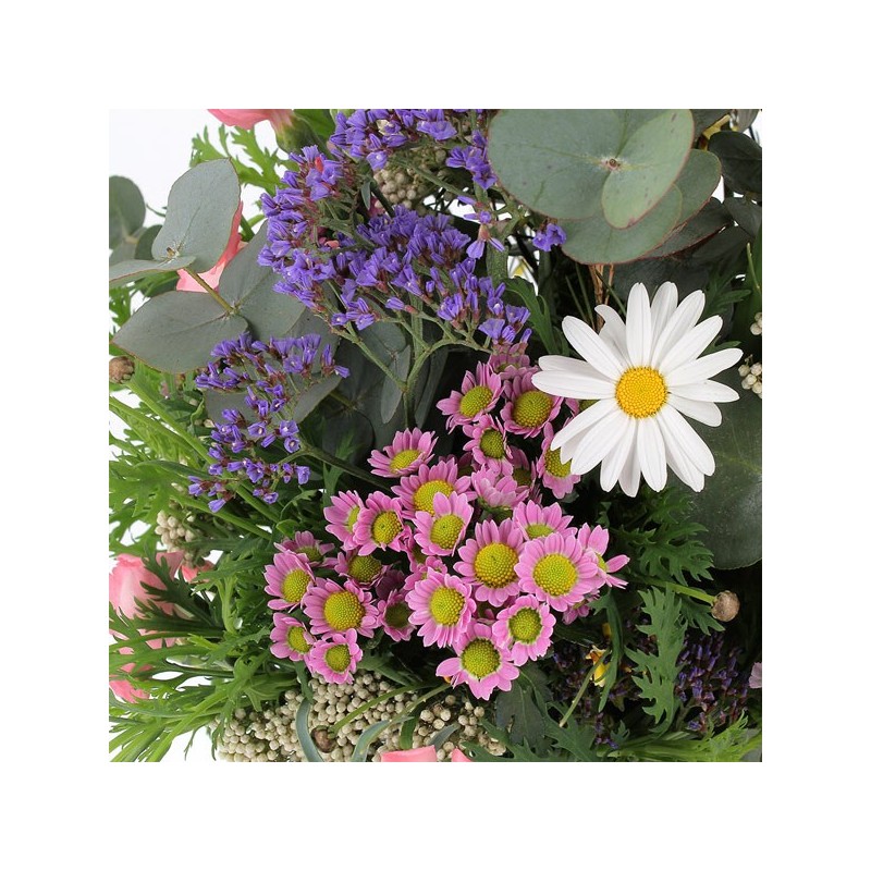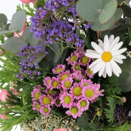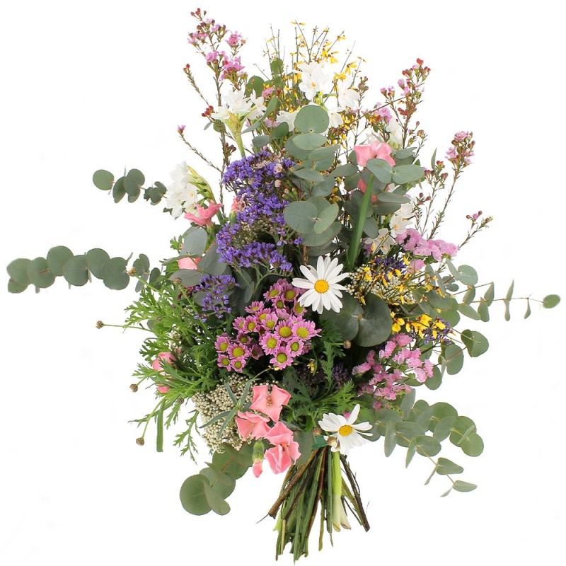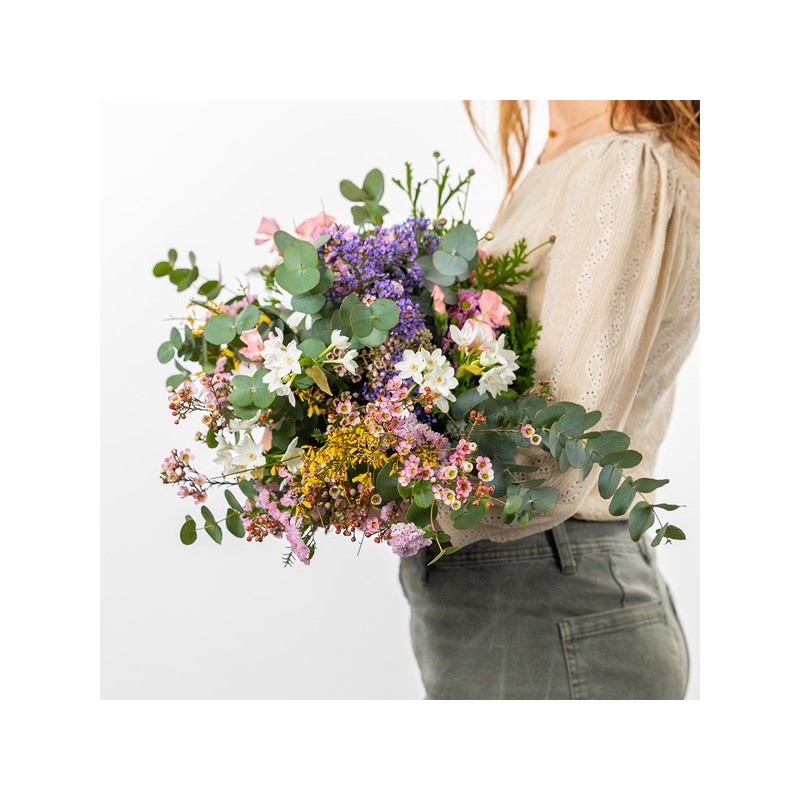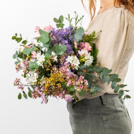 Bouquet dans les tons pastel composé de fleurettes champêtre et d'eucalyptus