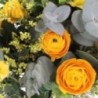Bouquet dans les tons jaunes composé de renoncules, roses et fleurettes de saison. L'ensemble accompagnée de feuillage et de branches d'eucalyptus.