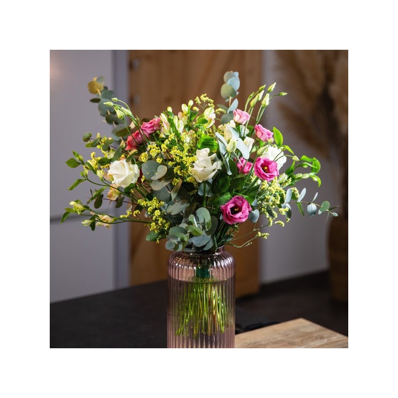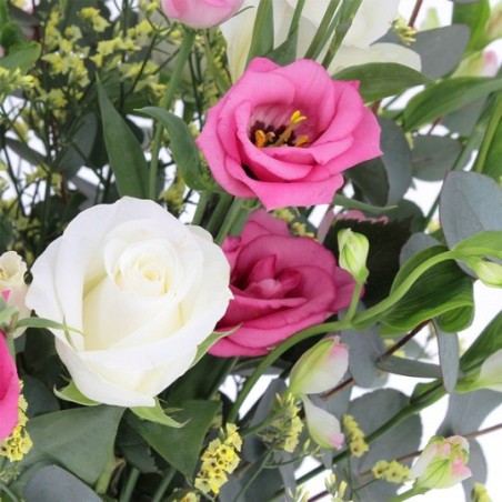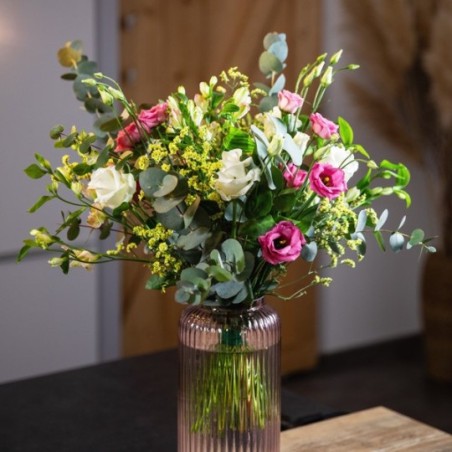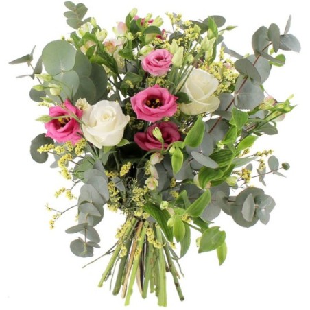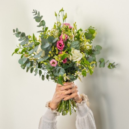 Bouquet champêtre composé de lisianthus, roses, freesias et fleurs de saison, l'ensemble accompagné de feuillages.