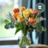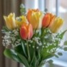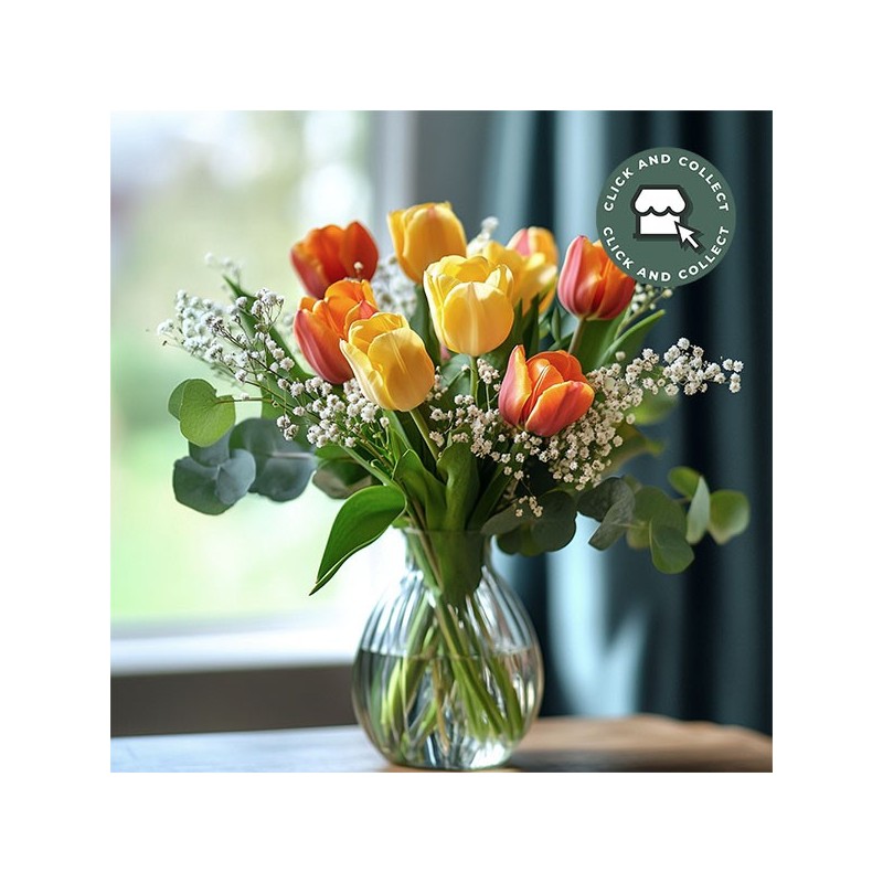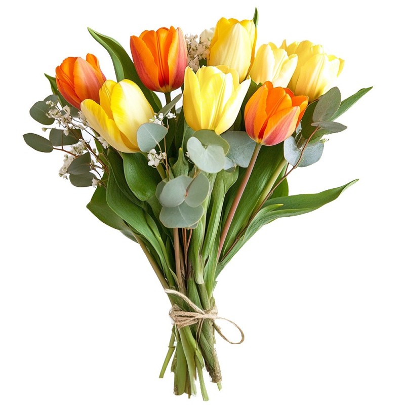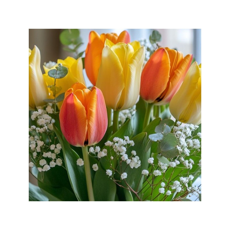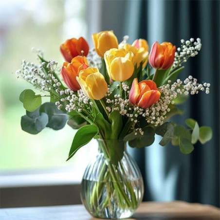 Bouquet champêtre dans les tons vert et jaune et orange. Composé de tulipes jaunes et orange, gypsophile et eucalyptus.